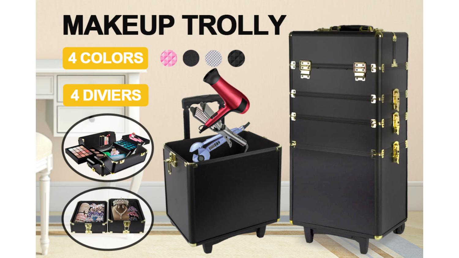 Meet the TSB Living Portable Makeup Trolley with Wheels, Travel Handle – your ultimate travel companion for glamour on the go! Crafted with a durable aluminium frame and Grade A materials, this beauty case is a testament to strength and sophistication. More than just spacious, it also features a pull-out wheeler travel handle, a detachable top compartment, and four adjustable dividers.