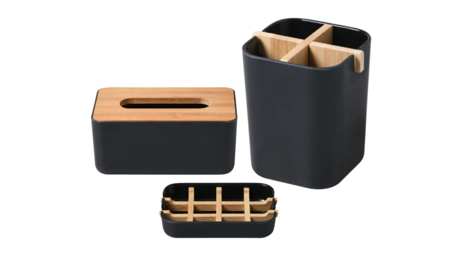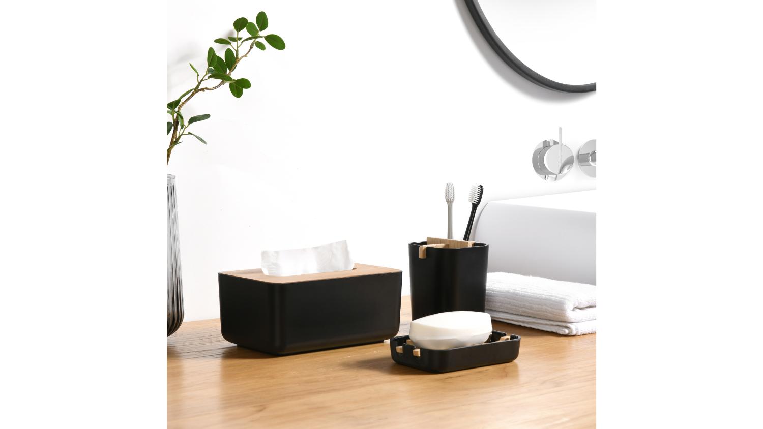 Keep your shower area neat with the TAKARA "Takae" Modern Bathroom Organiser Set 3pcs! This functional and stylish set features a tissue box, soap dish, and toothbrush holder, all crafted from beautiful Moso bamboo. The natural variations in the bamboo grain make each piece unique, adding a touch of organic warmth to your space.