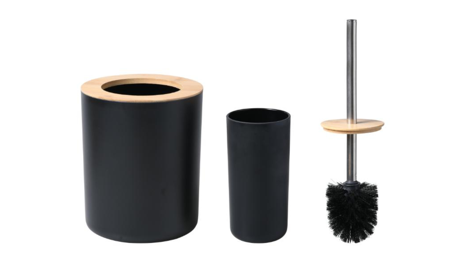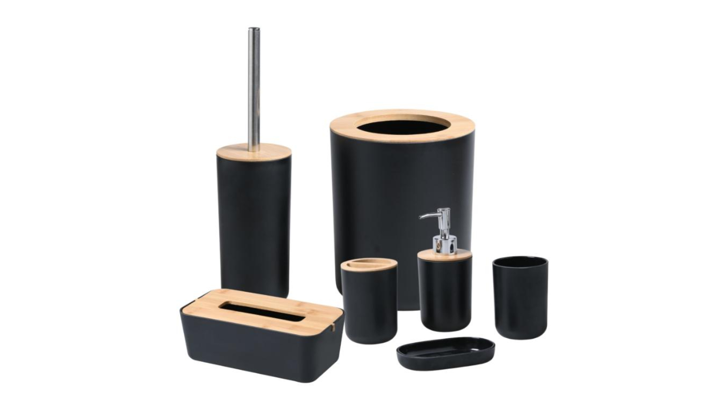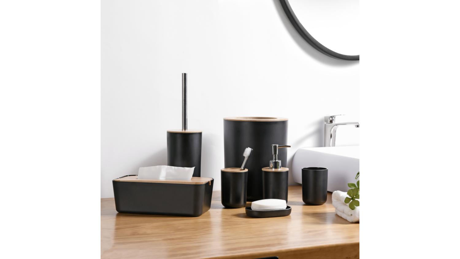 Take control of your bathroom clutter with the TAKARA "Takae" Modern Bathroom Organiser Set 7pcs! This all-in-one set includes a toothbrush holder, bathroom organiser, tissue box, soap dispenser, and soap dish, as well as key bathroom accessories, including a toilet brush and rubbish bin. It is elegantly crafted with bamboo and designed for any bathroom or powder room.