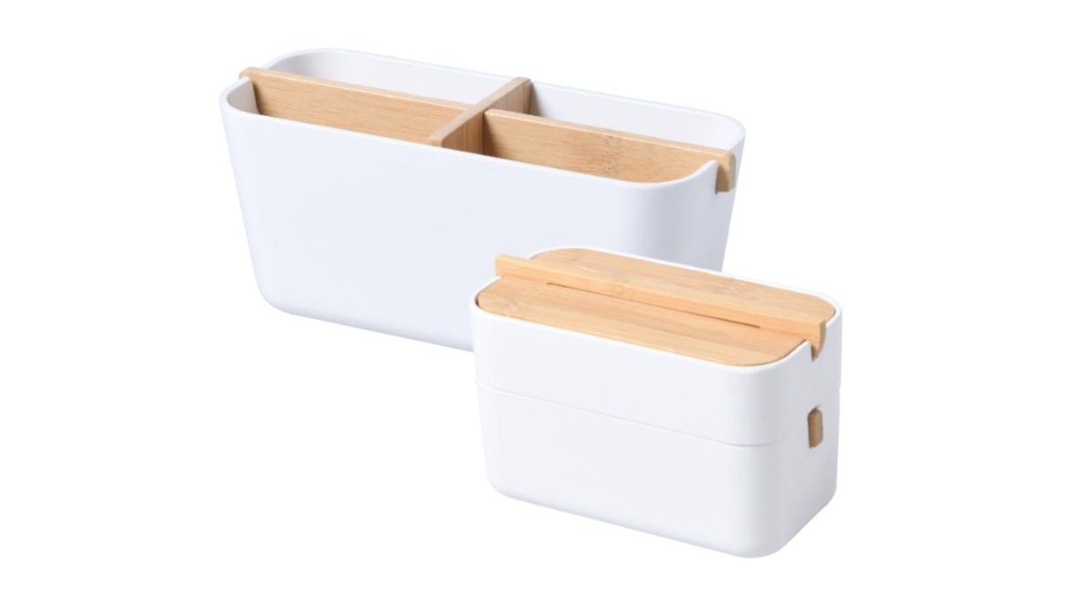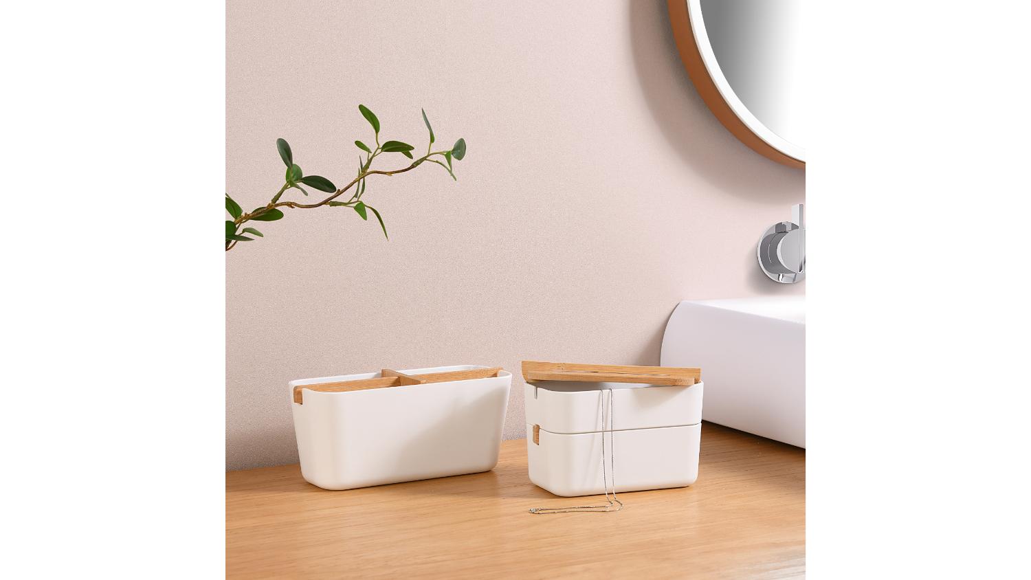 Easily organise your personal care items and accessories with the TAKARA "Takae" Modern Vanity Storage Set 2pcs! This simple, elegant, and minimalistic container can be used to store small items. Made from sustainable Moso bamboo, this stylish and functional set adds a touch of modern elegance to any bathroom, vanity, bedroom, lounge area, or kitchen countertop.