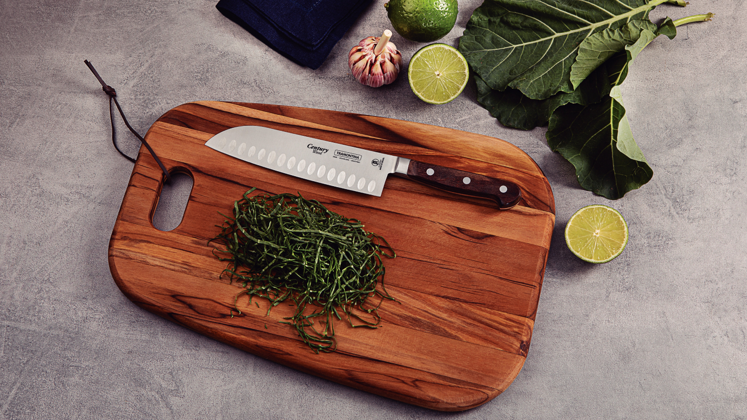 The Tramontina Century Wood Santoku Knife is your go-to tool for effortless slicing, dicing, and chopping. Its special forged stainless-steel blade delivers precision and durability, while the treated wood handle with stainless-steel rivets ensures a comfortable, steady grip. Designed for convenience, this impact-resistant knife is also dishwasher-safe for easy cleanups.