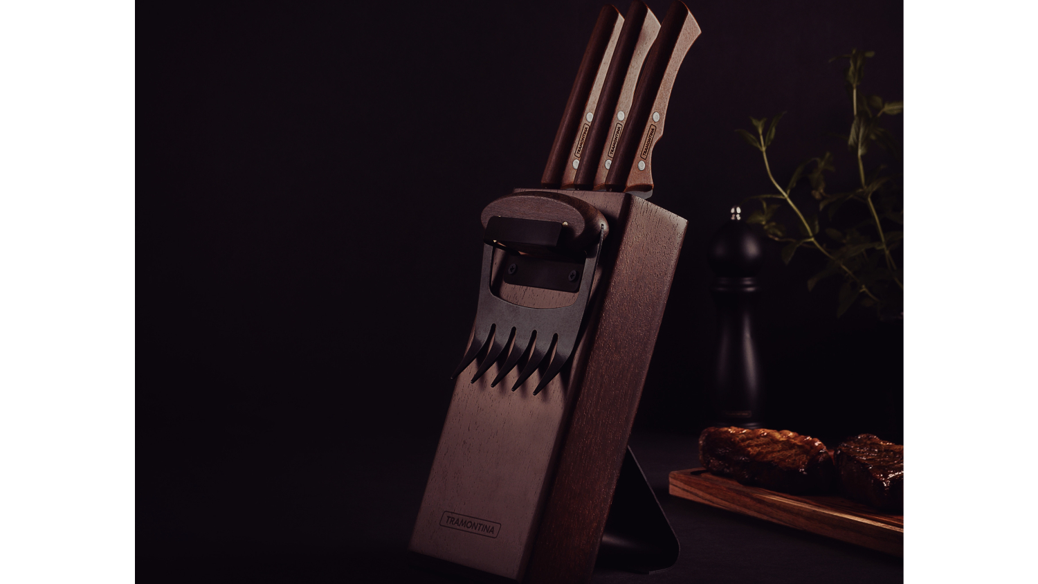 Elevate your grilling game with the Tramontia Churrasco Black Collection Barbeque Essential. This set includes three high-quality knives with a durable blackened stainless-steel blade and comfortable wooden handles, along with a versatile claw. It’s ideal for preparing and serving roast meat. The set also comes with a stylish wooden block for convenient storage, making it the perfect addition to any grill master's arsenal.