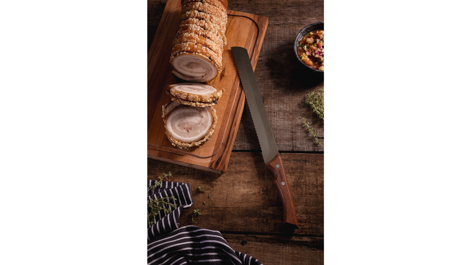 The Tramontina Churrasco Black Collection Serrated Knife is a must-have for any grill master and meat enthusiast! Featuring a blackened stainless-steel blade and a sturdy 10-inch wooden handle, this tool offers exceptional sharpness and durability, effortlessly cutting through briskets with precision. Made in Brazil, this knife embodies quality, strength, and style.