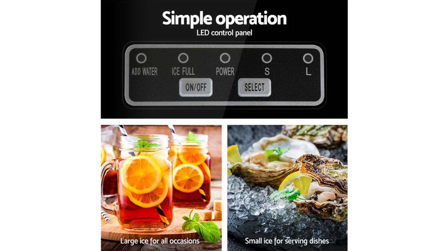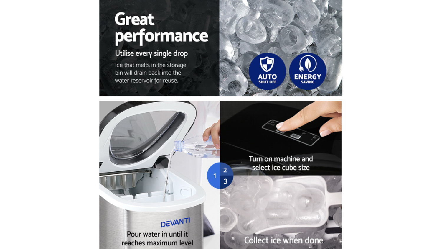 Functional and convenient, Devanti 2.4L Portable Ice Cube Maker lets you enjoy refreshing ice-cold drinks! This unit can make ice cubes in minutes, with three size options to match your needs. It boasts a generous 3.2L water tank capacity, suitable for both home and commercial use. Plus, it operates quietly while the large fan dissipates heat effectively.