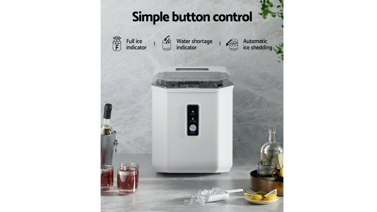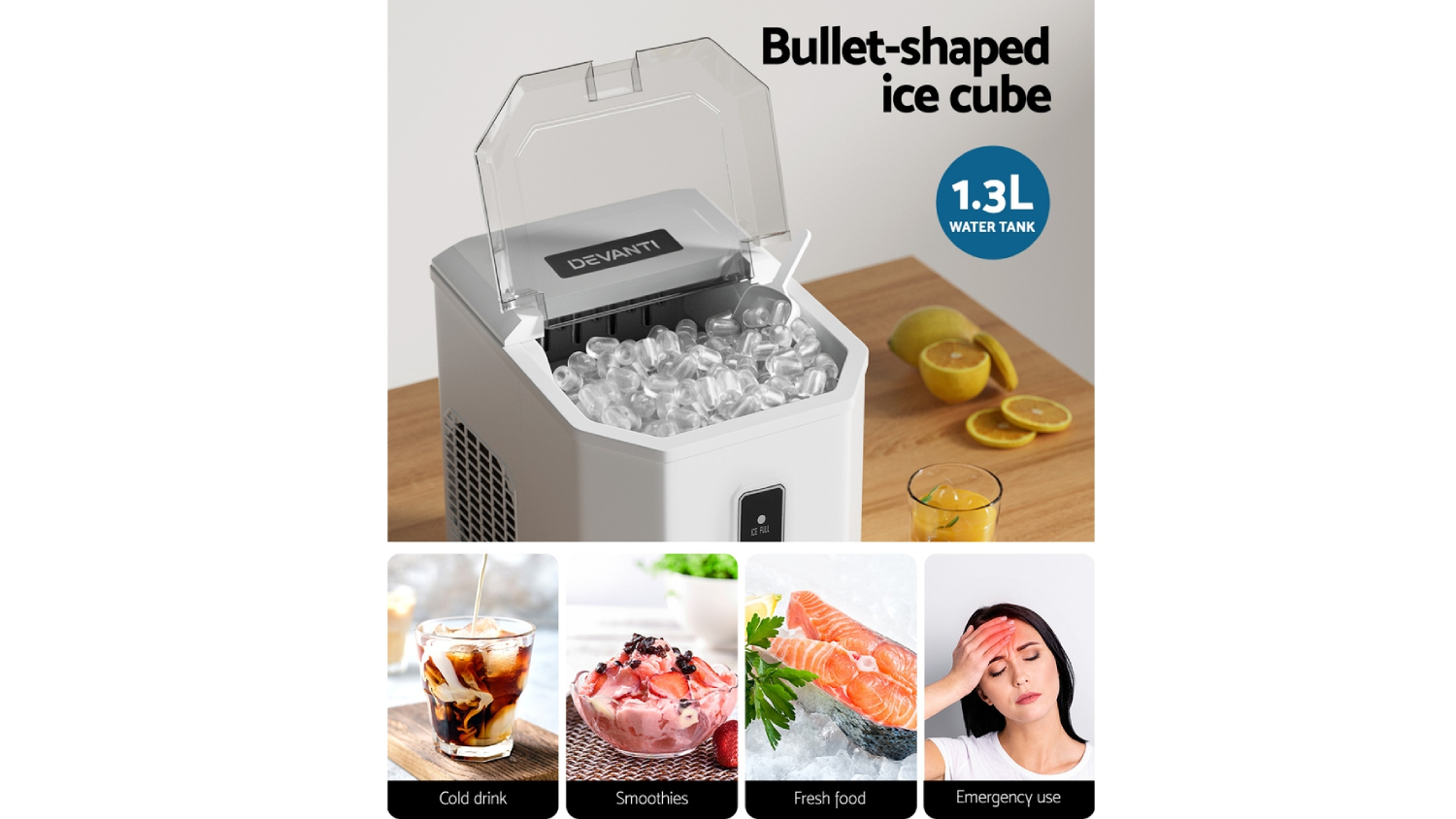 Beat the heat with fresh ice in minutes! The Devanti Benchtop Ice Maker 1.3L creates refreshing ice cubes on demand. With high ice-making capacity, this unit can produce up to 12kg of ice per 24 hours. It's also loaded with nifty features like easy-to-use controls, water shortage and ice full alarms, plus energy-saving technology through Freon-free refrigerant and enhanced heat dissipation. Its sleek, compact design fits anywhere.