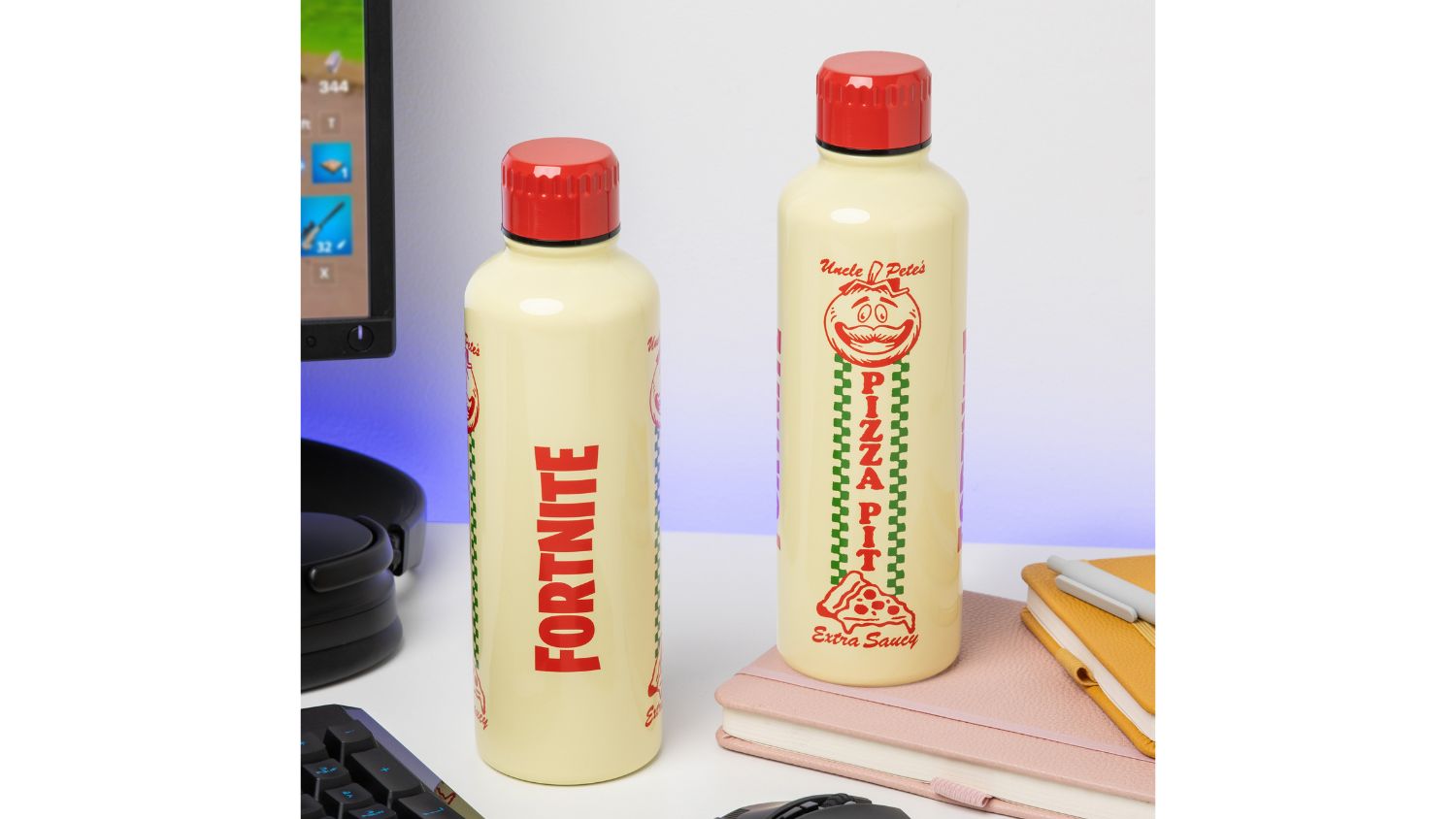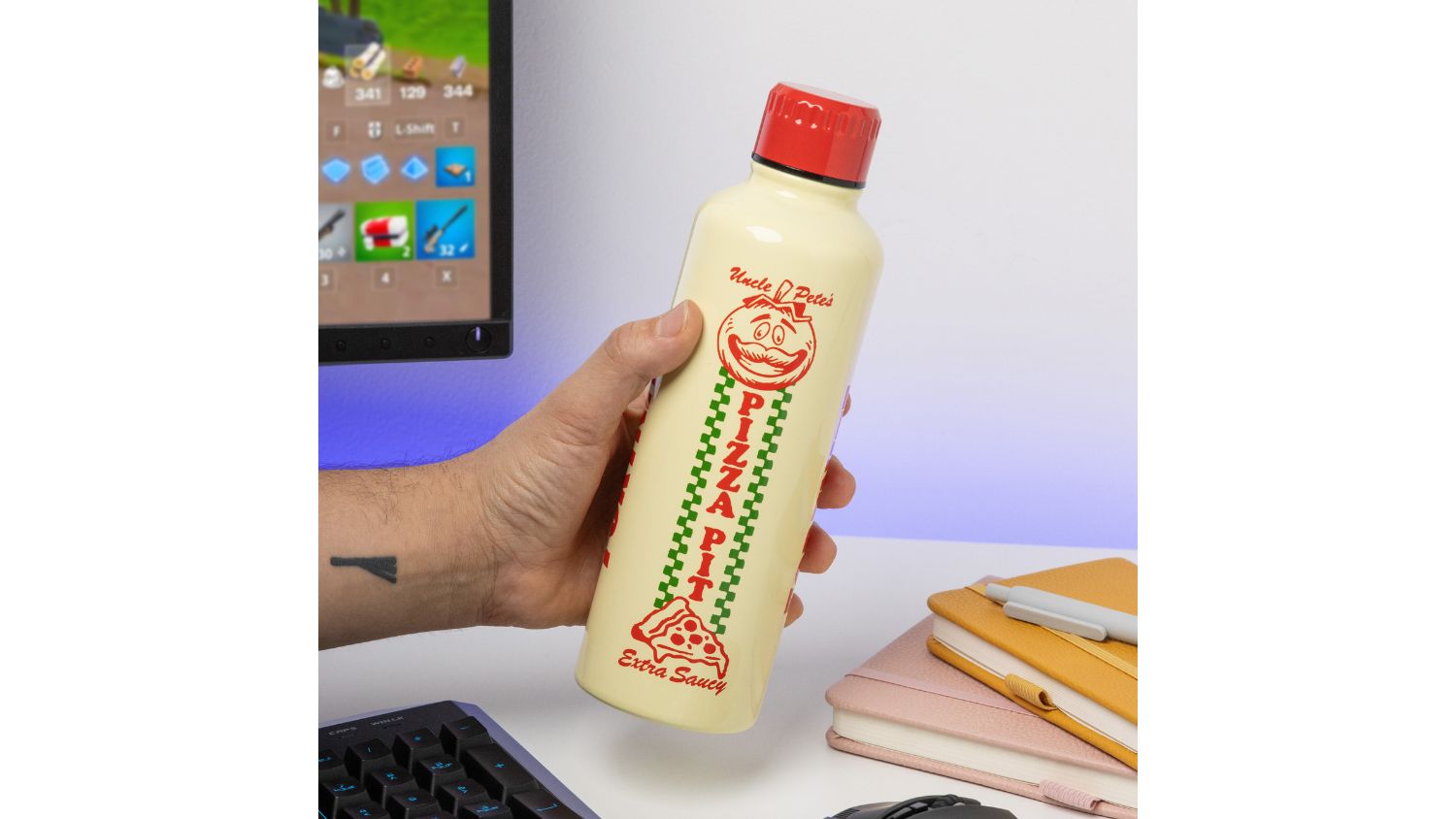Level up your hydration with the Paladone Metal Water Bottle, inspired by Uncle Pete's Pizza Pit in Fortnite! This 500ml stainless steel bottle keeps your drinks perfectly hot or cold for longer. This officially licensed Fortnite collectible is perfect for home or as a unique gift for any fan.