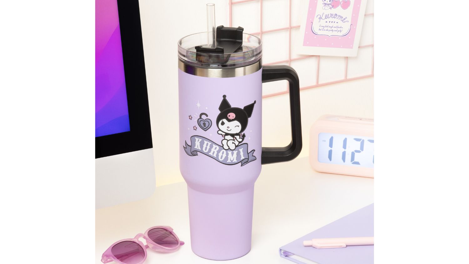 Enjoy comfortable sipping anywhere with the Paladone Themed Travel Cup with Lid, Straw 900ml featuring Kuromi. This officially licensed Sanrio-themed cup holds a generous 900 ml capacity, making it the ideal collectible for any fan. It’s also designed with a comfort-grip handle, a versatile multi-way lid, and a narrow base that fits cup holders.