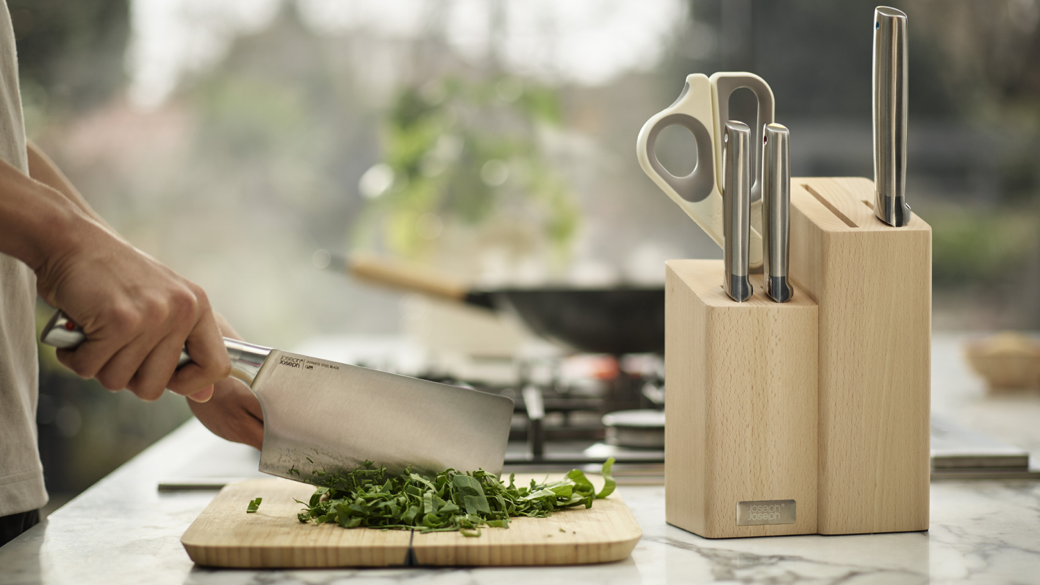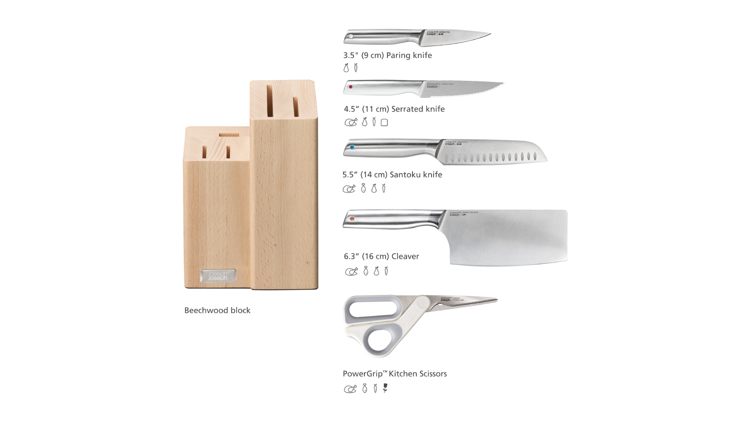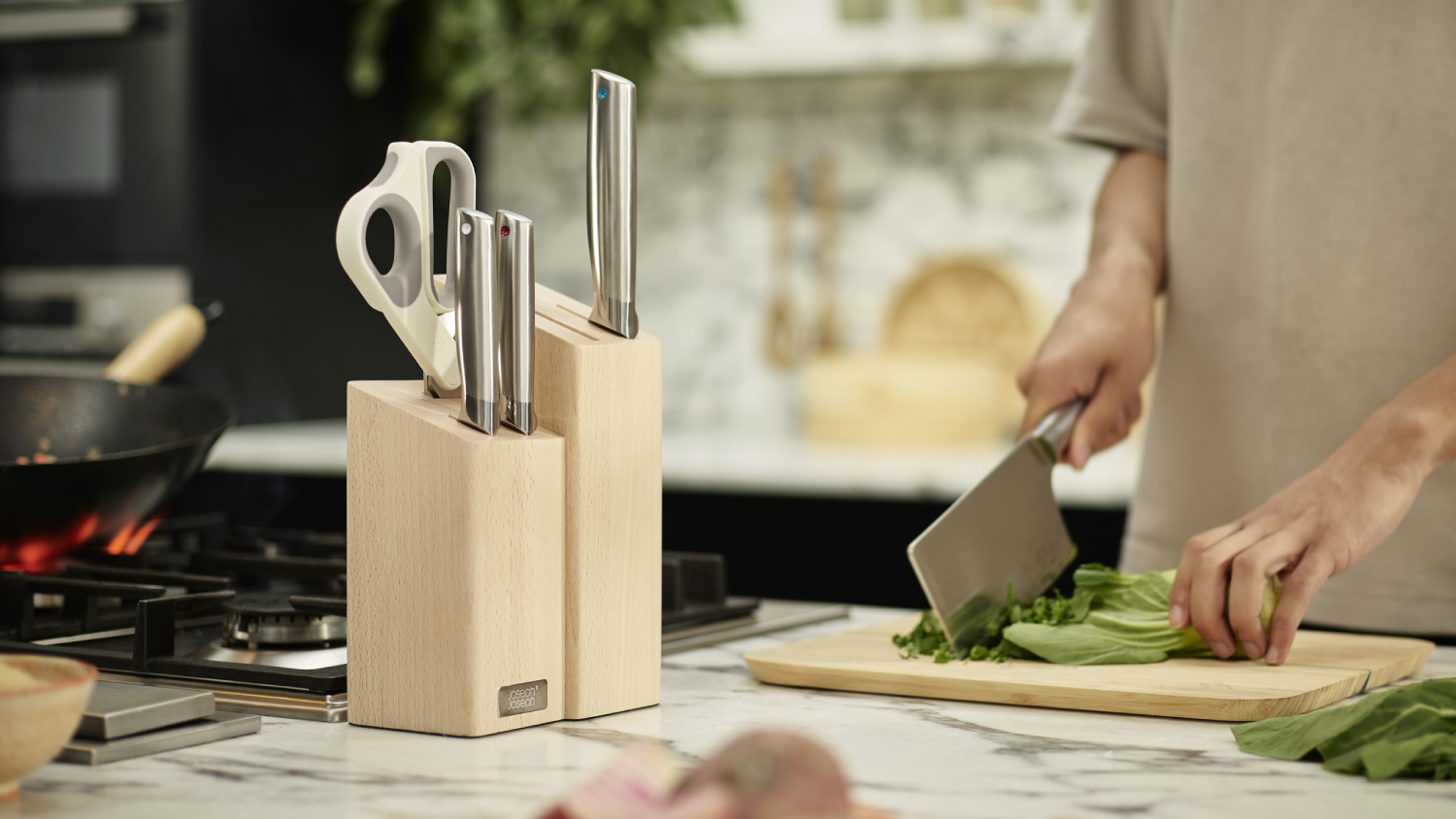 Streamline your meal prep experience with the Joseph Joseph "Elevate" Knife and Scissor Block 5pcs. This all-in-one set includes a Paring knife, Serrated knife, Santoku knife, Cleaver, and PowerGrip kitchen scissors, all neatly organised in a Beechwood knife block. Crafted from Japanese stainless steel, this set offers exceptional durability and precision.