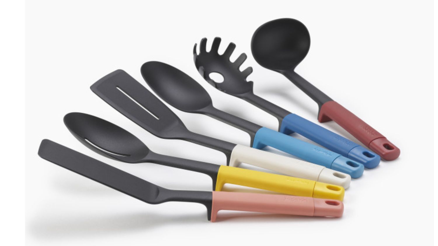 Say goodbye to messy countertops with the Joseph Joseph Elevate Utensil and Storage Carousel Set. This bundle includes a solid spoon, slotted spoon, slotted turner, flexible turner, a spaghetti claw, and a ladle. Each utensil has a weighted handle and integrated rest, so the head never touches your work surface. With heat-resistant nylon heads (up to 200˚C) and ergonomic silicone handles, these tools are perfect for non-stick cookware. Plus, the rotating stand with a non-slip base makes grabbing the right tool a breeze.