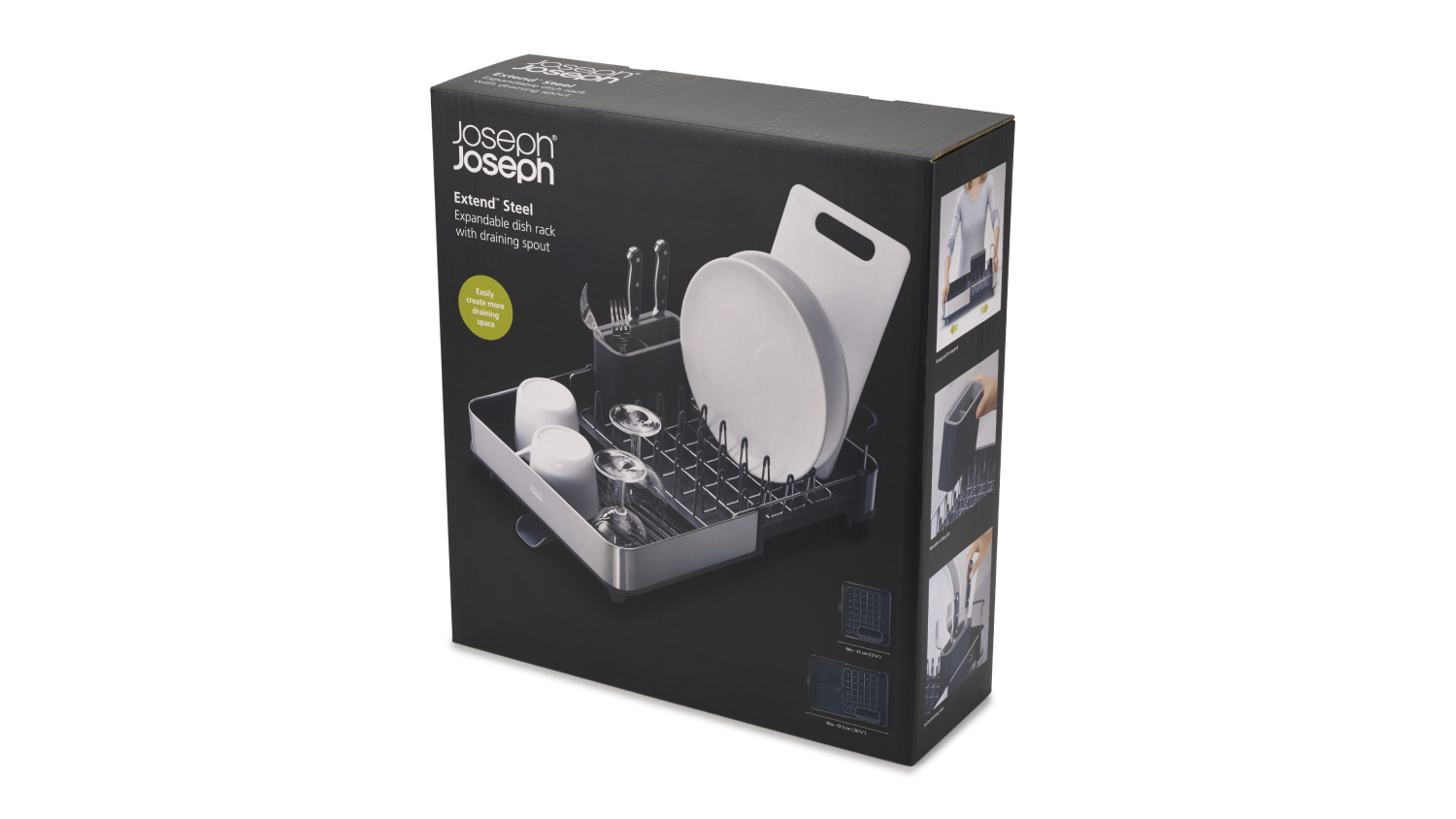 Upgrade your kitchen storage with the Joseph Joseph Extend Adjustable Benchtop Dish Rack! This versatile organiser extends to nearly double its size, providing extra space when you need it. With an integrated plug for water drainage, a sloping base to direct water away, and raised ribs to ensure water drains away easily, this rack combines practicality with smart design.