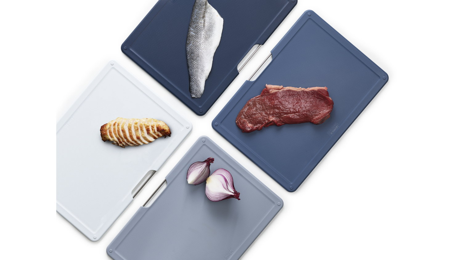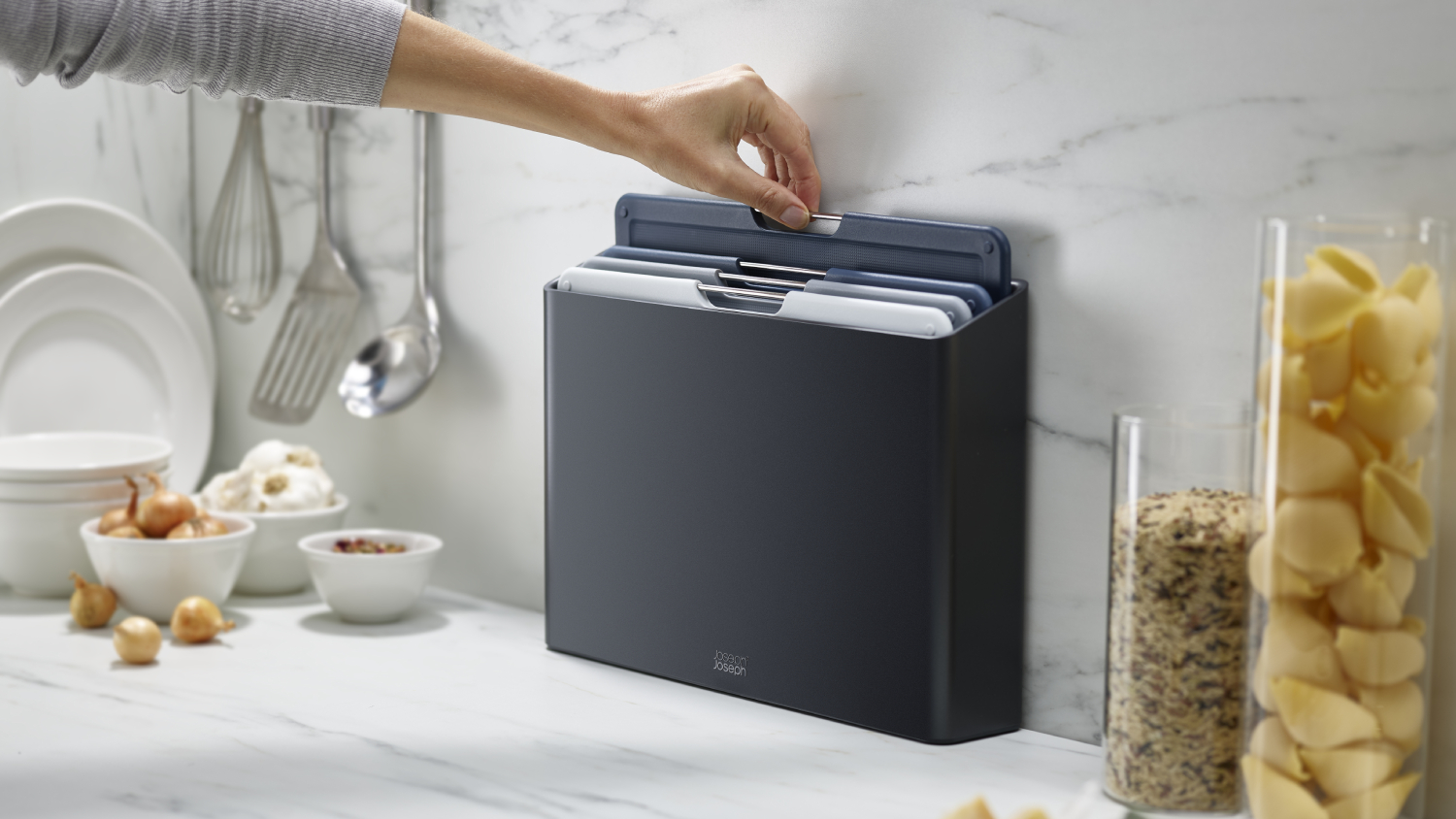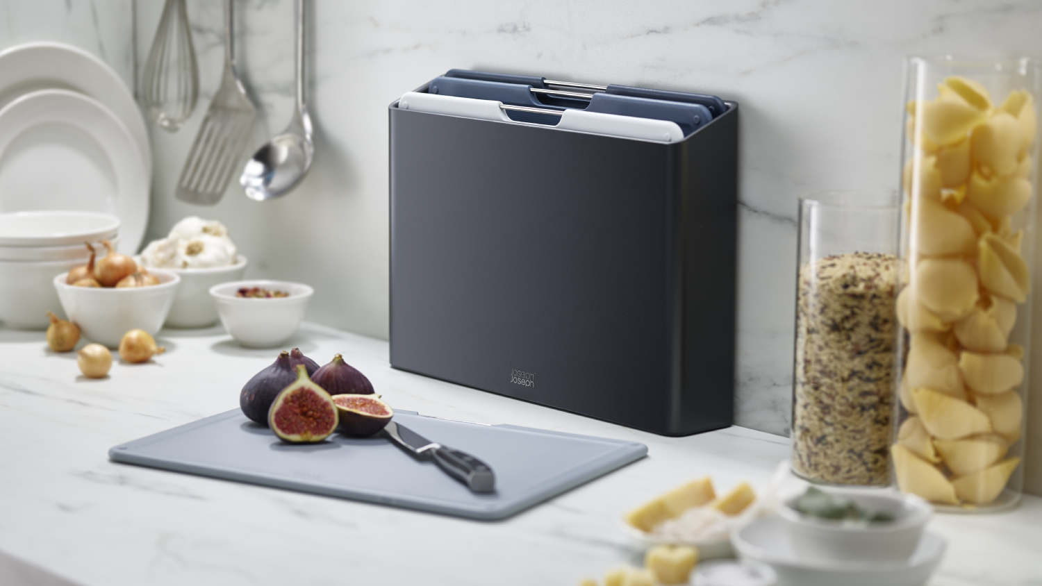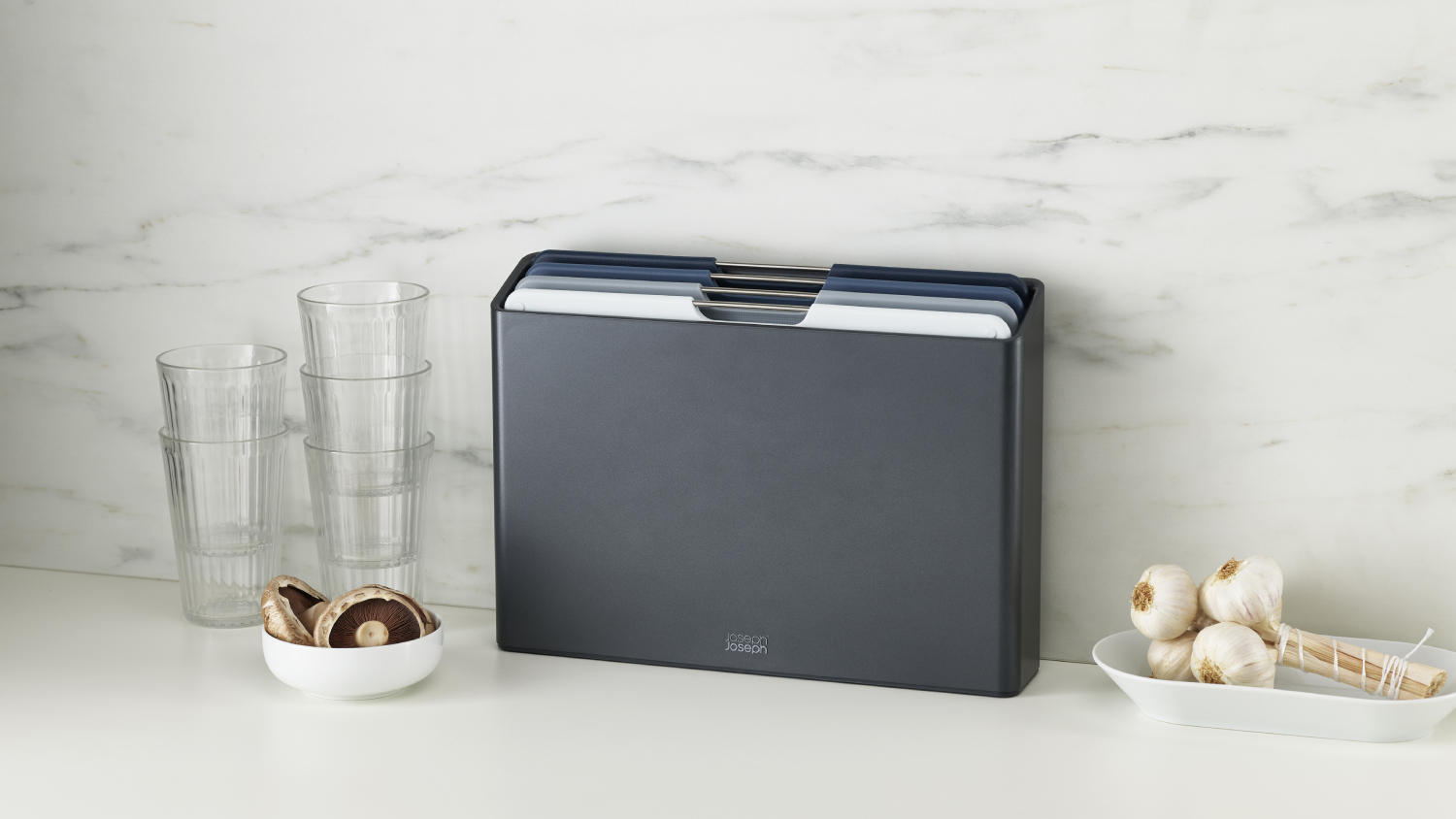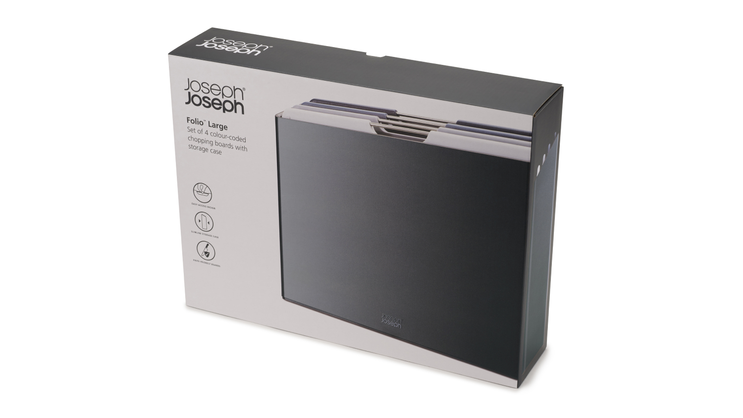 Keep your kitchen organised and your food prep hygienic with the Joseph Joseph Matte Graphite Chopping Board Folio Large. This innovative kitchen tool includes four colour-coded chopping boards that are perfect for handling various food types separately, helping prevent cross-contamination. Each board also features non-slip feet and a knife-friendly, textured cutting surface.