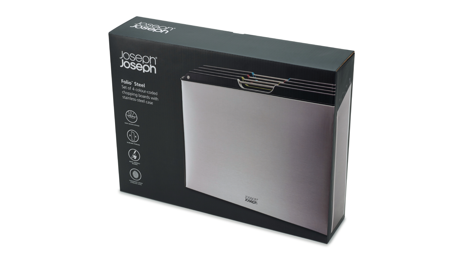 Keep your kitchen organised and your food prep hygienic with the Joseph Joseph Stainless Steel Chopping Board Folio. This innovative kitchen tool includes four minimalist colour-coded chopping boards that are perfect for handling raw meats, vegetables, fish, and cooked foods separately, helping prevent cross-contamination. Each board also features non-slip feet and a knife-friendly, textured cutting surface.