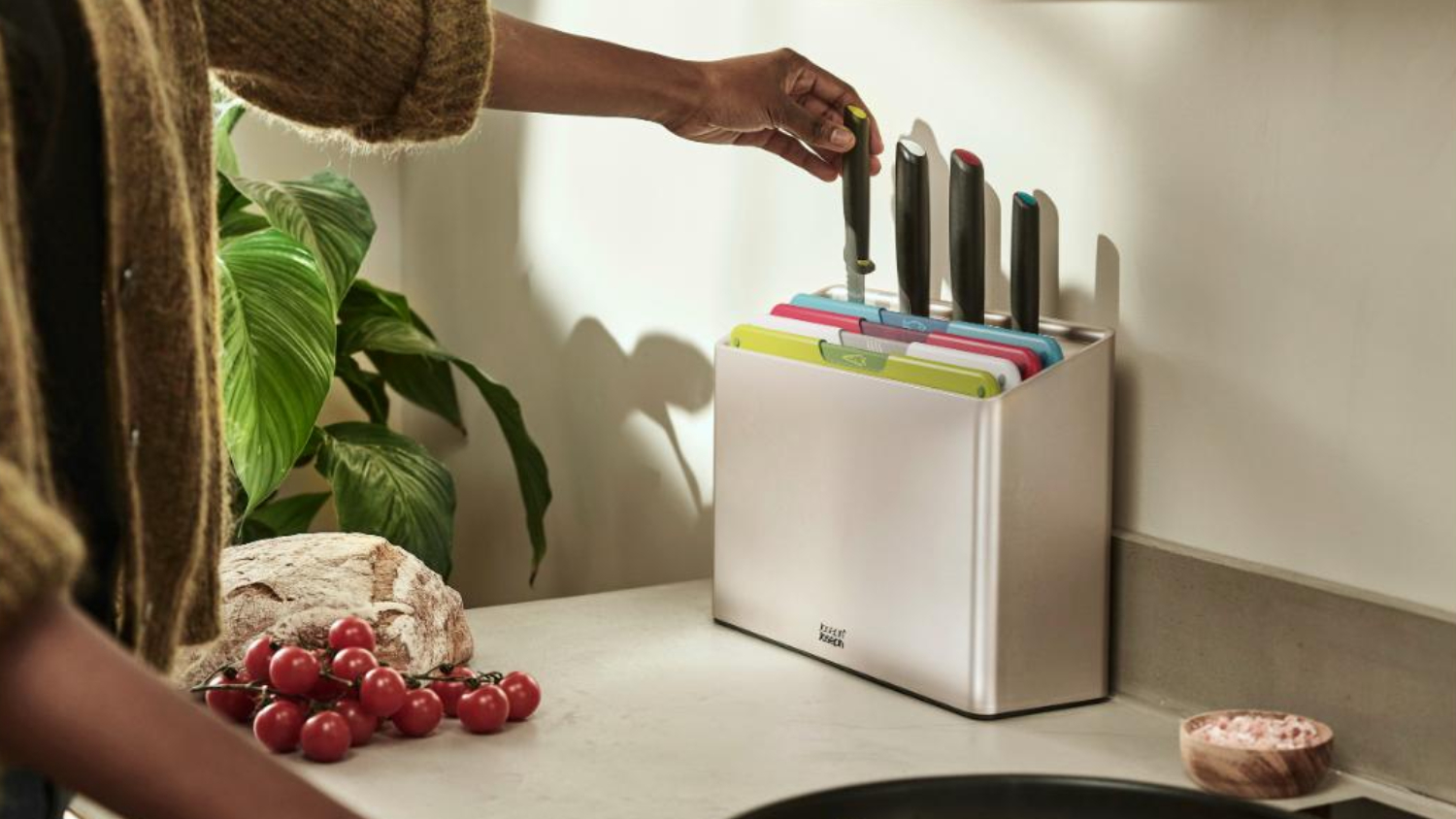 The Joseph Joseph Stainless Steel Chopping Board Folio with Stainless Steel Knife Set 4pcs is the ultimate solution for all your food prep needs. This sleek set features four food-specific, non-slip chopping boards and four high-quality knives—a 3.5" Paring knife, a 4.5" Serrated knife, a 5.5" Santoku knife, and a 6.5" Chef’s knife. Plus, the Elevate knives are made of Japanese stainless-steel blades for superior cutting performance.