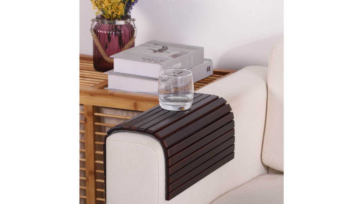 Bid farewell to the woes of spills, crumbs, and untidy armrests with the Sherwood Home Flexible Sofa Armrest Tray! Crafted from 100% natural bamboo, this sofa armrest tray is more than just a functional accessory – it's a statement of elegance and durability. No matter the shape of your sofa's armrest, it effortlessly fits, thanks to its flexible design. Plus, its anti-slip base ensures that your items stay securely in place, providing a stable platform.