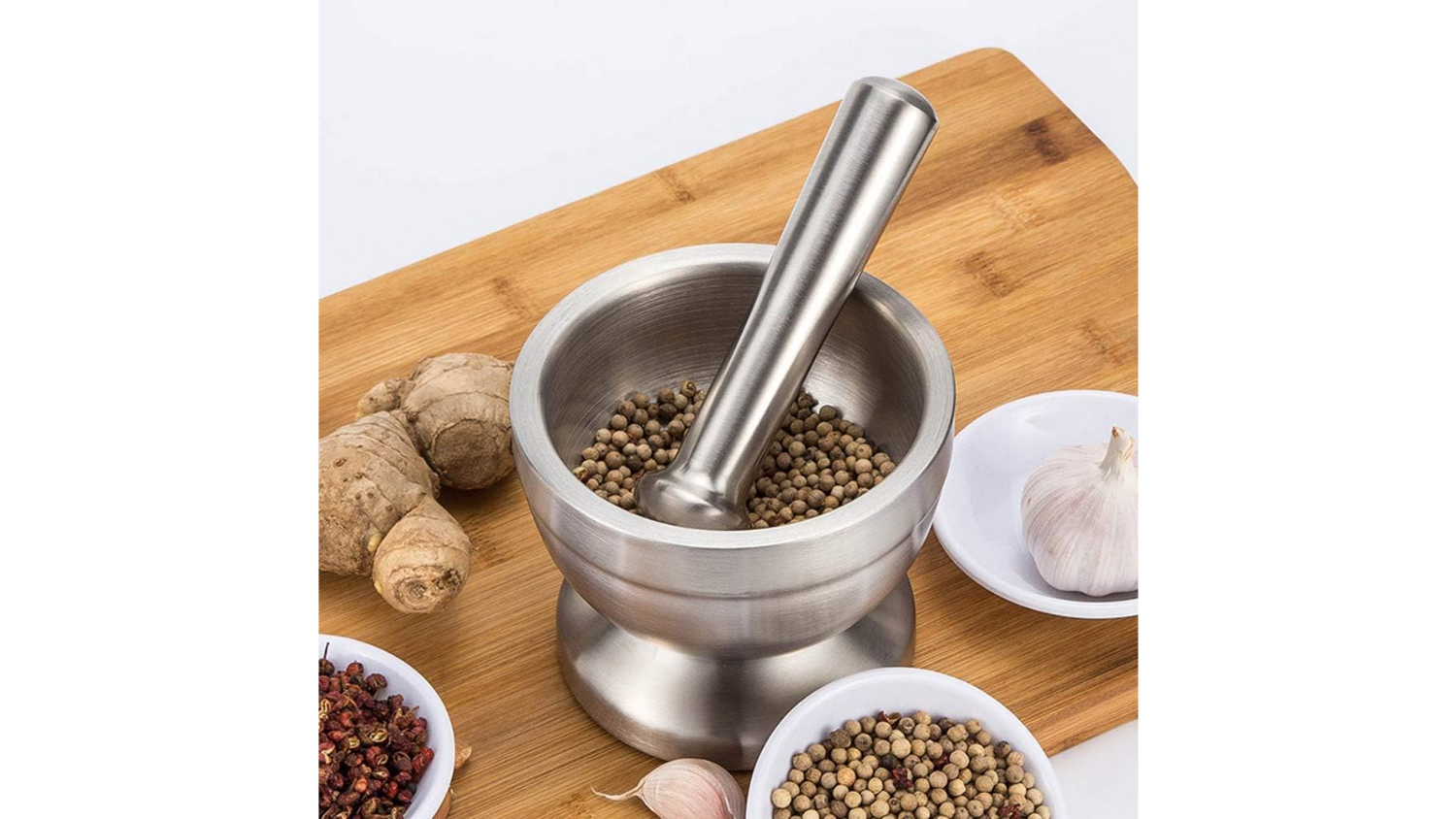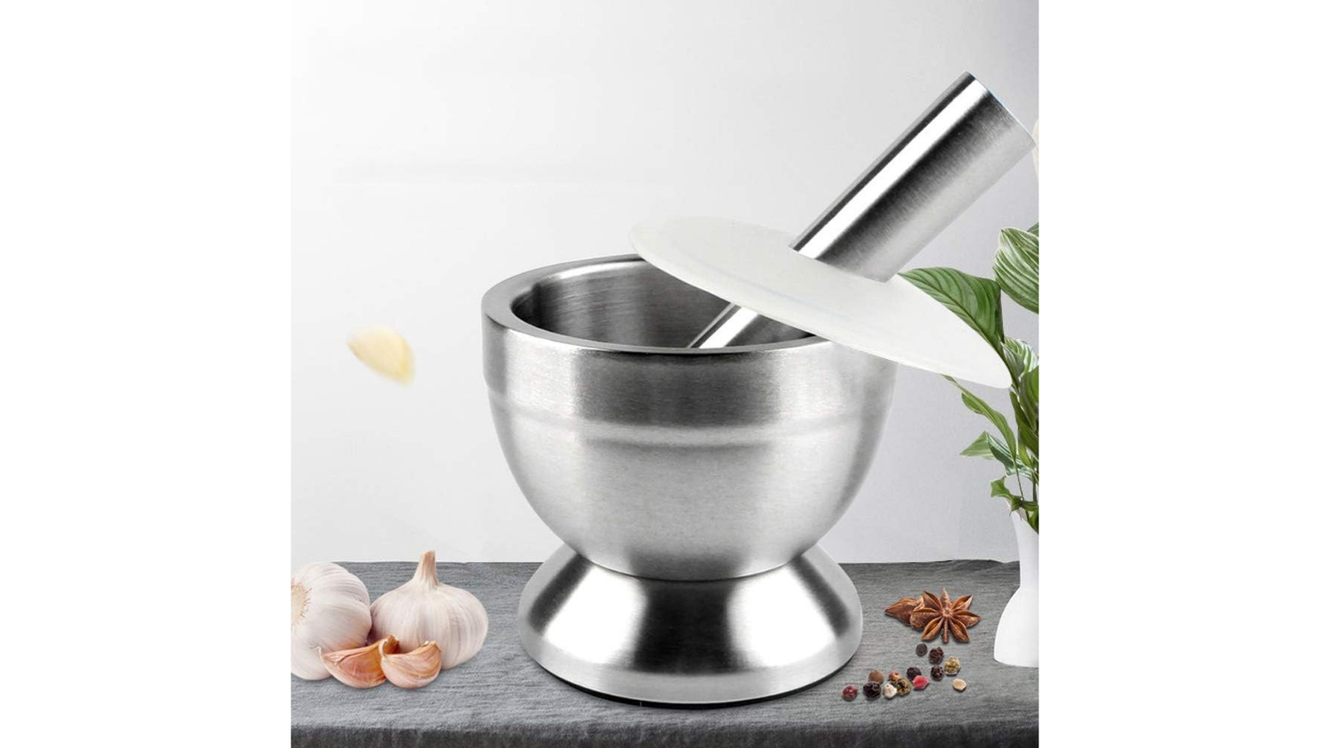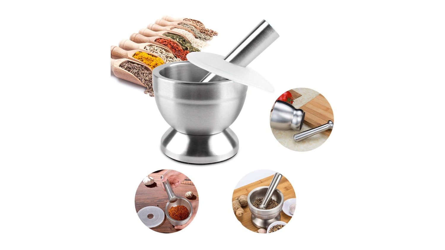 Spice up your culinary creations effortlessly with the Kmall Stainless Steel Mortar and Pestle with Cover. Featuring a translucent lid to contain mess, an anti-slip base for stability, and a comfortable grip for grinding spices, this mortar and pestle set is a must-have for every kitchen enthusiast. It is also engineered from food-grade stainless steel, making it durable and dishwasher-safe.