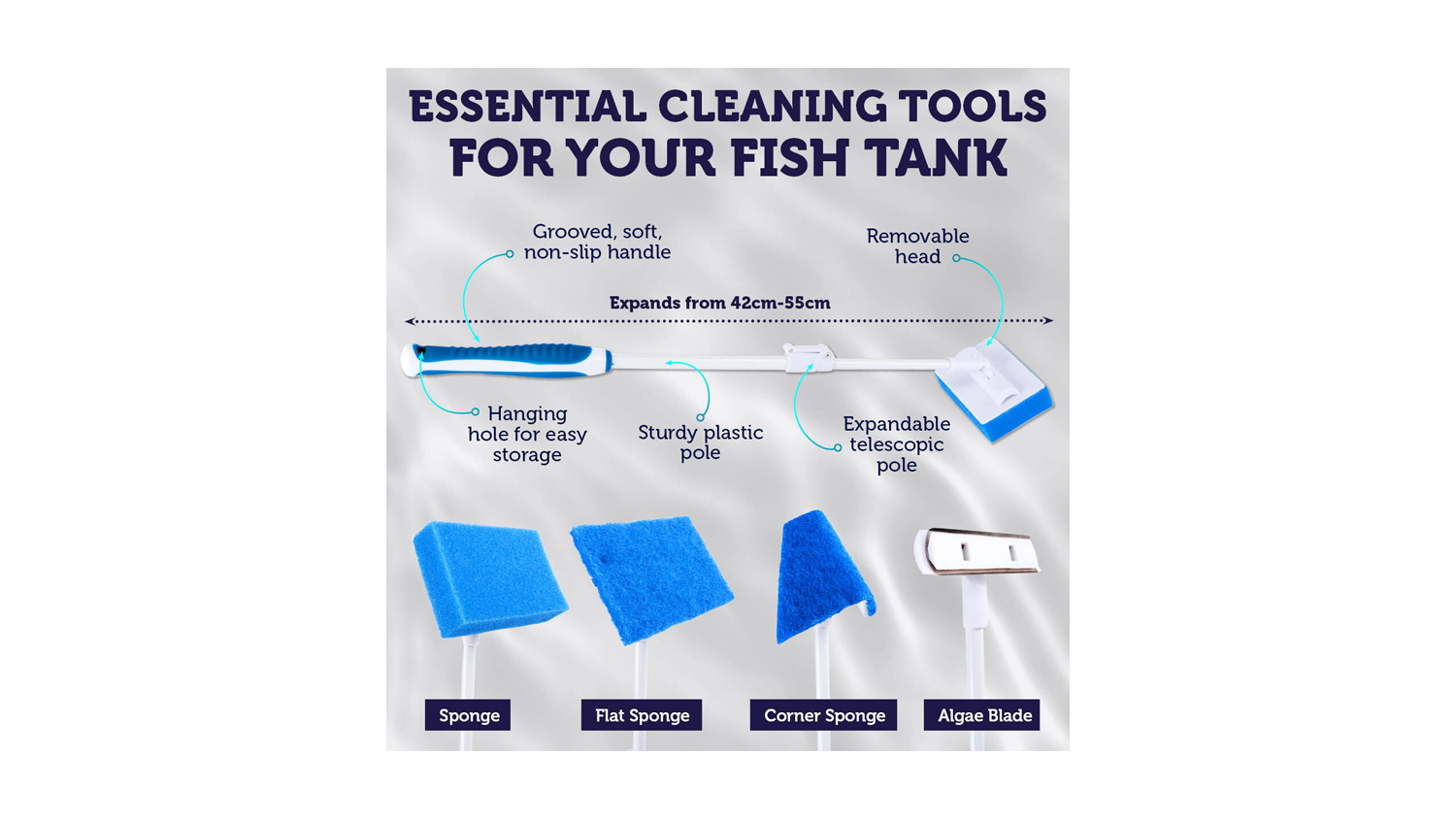Clean and maintain your home aquarium effortlessly using this versatile Multi-Purpose Aquarium Cleaning Kit. Featuring an expandable telescopic pole and four different head types, this handy kit is designed to tackle various aquarium cleaning tasks. The grooved, soft, non-slip handle also ensures a comfortable grip for added convenience. Plus, it is built with a hanging hole for quick and easy storage after use.