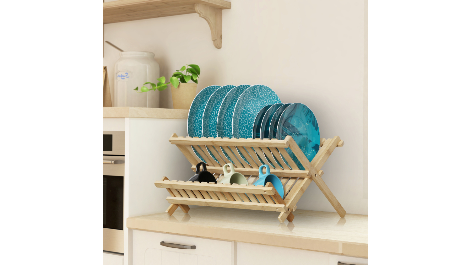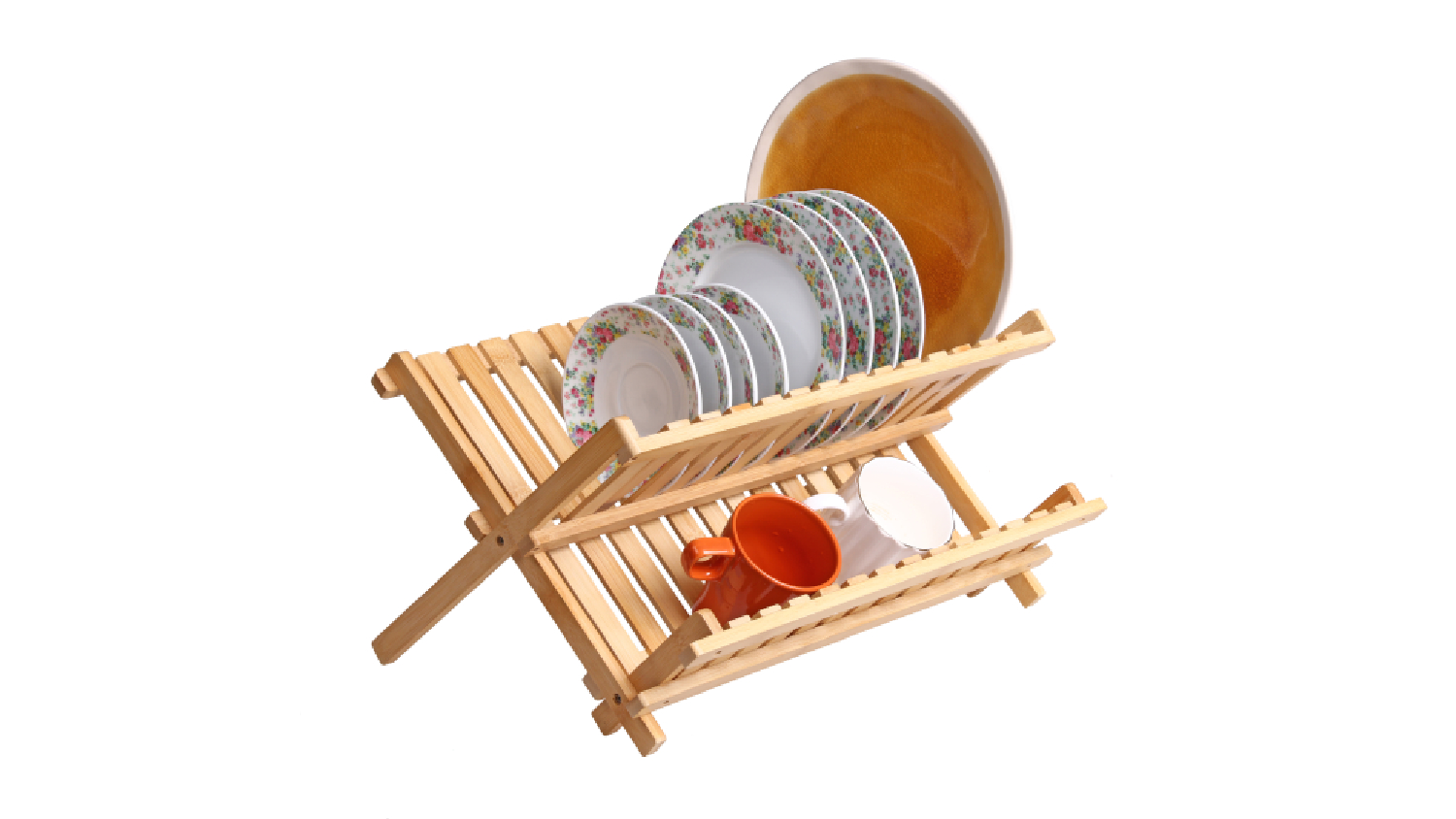 The Sherwood Home Folding Dish Rack is the perfect way to get your dishes dry and your kitchen organised in no time. The bamboo rack is sturdy and spacious, with upper slots to hold dinner plates upright, and a lower shelf for cups, mugs, glasses, and other kitchen utensils. And when you're not using it, it folds flat for easy storage.