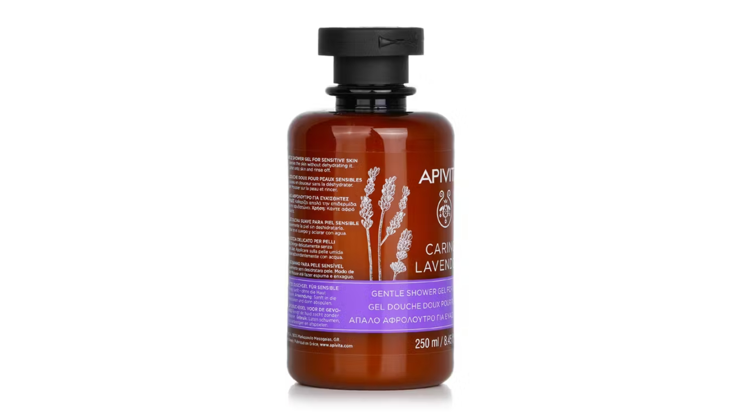 Enjoy a soothing bathtime experience with the Apivita Caring Lavender Gentle Shower Gel For Sensitive Skin 250ml/8.45oz. Formulated with 97% natural ingredients, this gel is a must-have addition to your daily routine. It combines Greek lavender and calendula extracts for anti-inflammatory relief, while Greek thyme honey, olive oil, and almond oil work to improve skin moisture and elasticity.