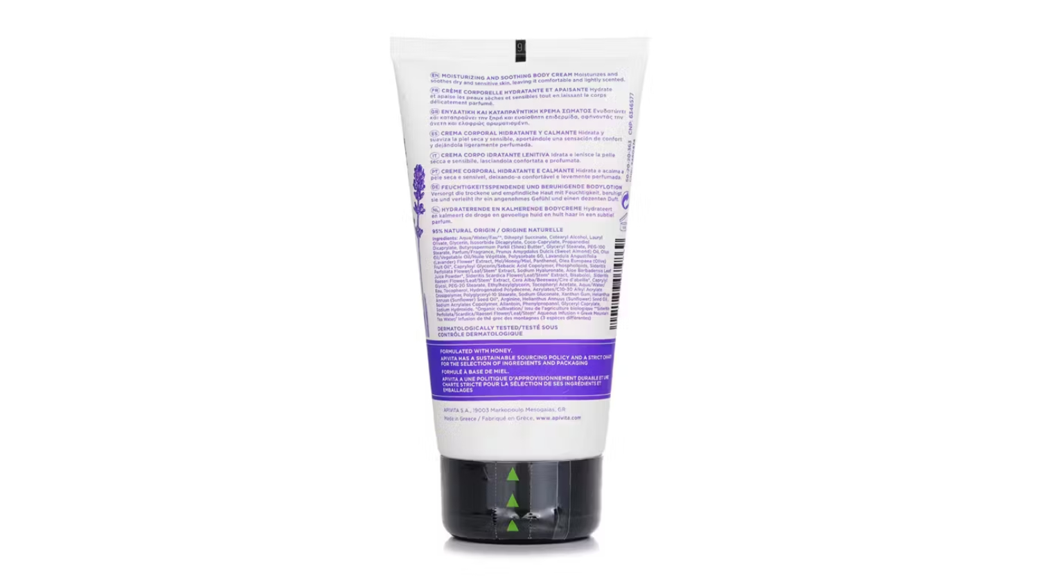 Soothe and hydrate sensitive skin with the Apivita Caring Lavender Moisturising and Soothing Body Cream 150ml/4.74oz. Enriched with Greek lavender extract and allantoin, this cream provides anti-inflammatory and calming benefits. It is also packed with Greek thyme honey, bio-active aloe, and Pro-vitamin B5, delivering instant hydration while Lauryl Olivate relieves itching and stinging.