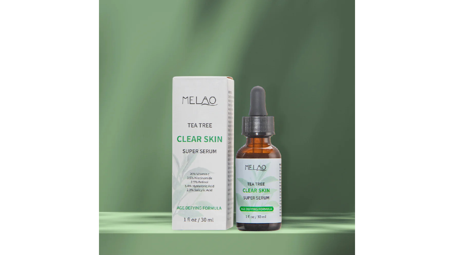 Revitalise your skin with the Melao Clear Skin Tea Tree Super Serum 30ml! Infused with tea tree oil, known for its antiseptic and anti-inflammatory properties, as well as 5 potent ingredients, 20% Vitamin C, 3.5% Niacinamide, 2.5% Retinol, 5.0% Hyaluronic Acid, and 2.0% Salicylic Acid, this serum helps repair and soothe damaged skin.