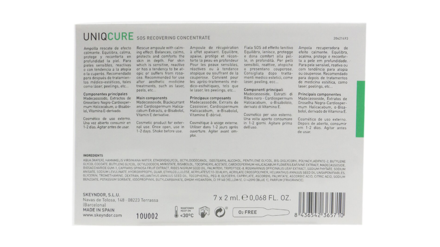 Get fast, soothing relief for sensitive or post-procedure skin with the SKEYNDOR Uniqcure SOS Recovering Concentrate. This calming ampoule helps balance, calm, protect and comfort the skin, perfect to use after lasers and peels. It also helps reduce skin hypersensitivity and chronic skin irritation.