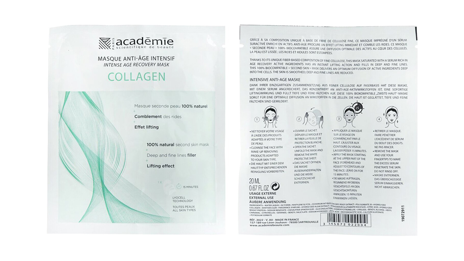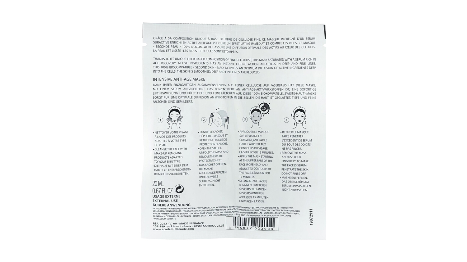 Revitalise your skin with the Academie Intense Age Recovery Mask. Made from 100% natural lyocell, this eco-friendly mask delivers a powerful serum deep into the skin. It boosts collagen, smooths lines, and leaves your skin visibly firmer and youthful in just 15 minutes.