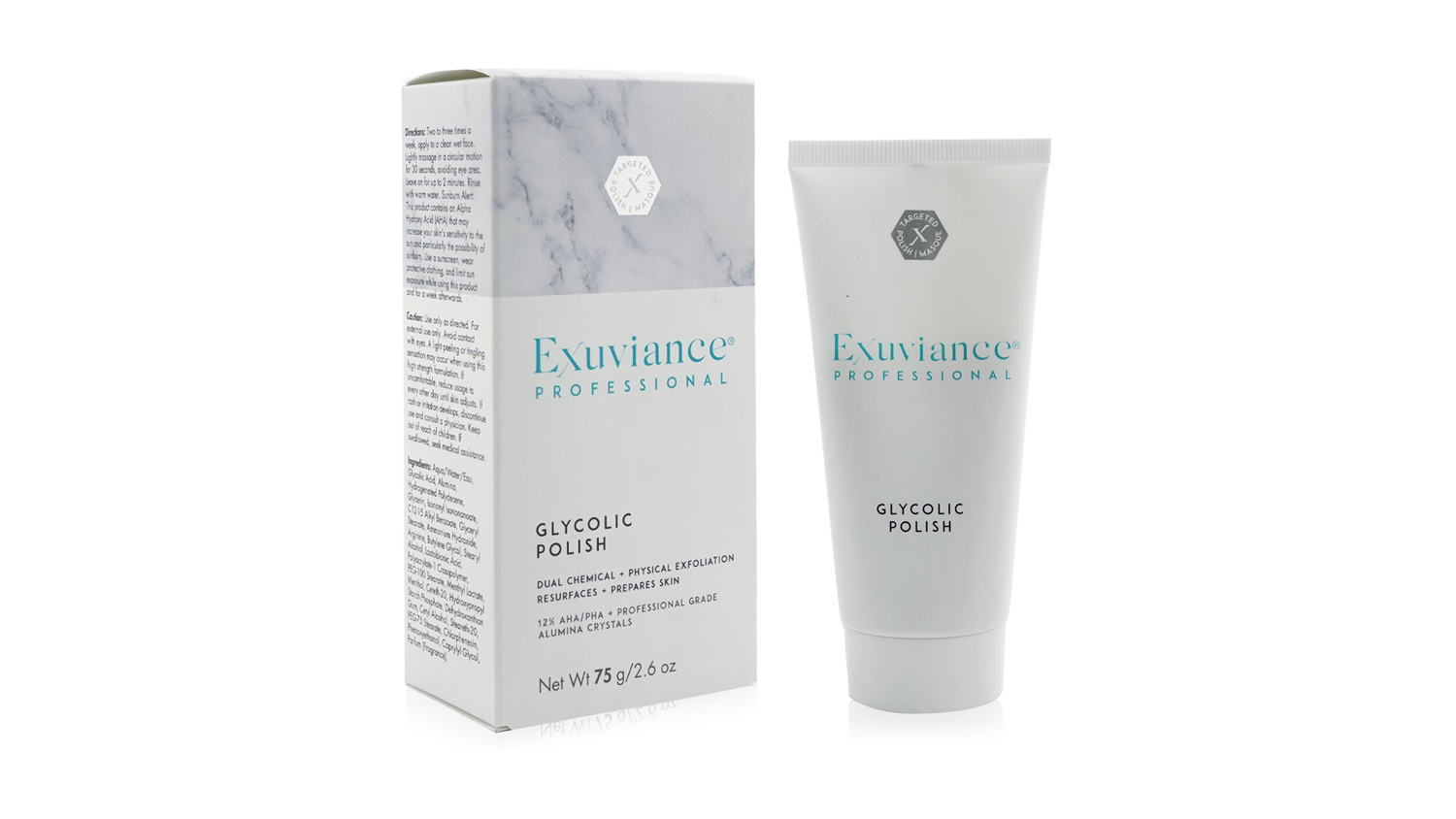 Reveal smoother, brighter skin with the Exuviance Glycolic Polish. This one-step exfoliator combines a 12% AHA/PHA blend with aluminium crystals to deeply polish and resurface your skin. It clears pores, removes impurities, and preps your face for the next step of your routine. It leaves your complexion radiant, refreshed, and perfectly even-toned.