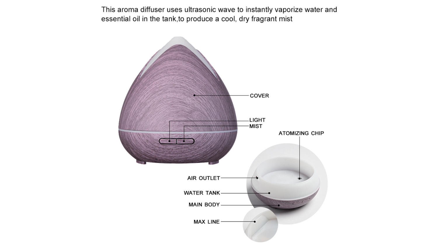 Purespa Ultrasonic Essential Oil Diffuser and Humidifier with Light - Violet