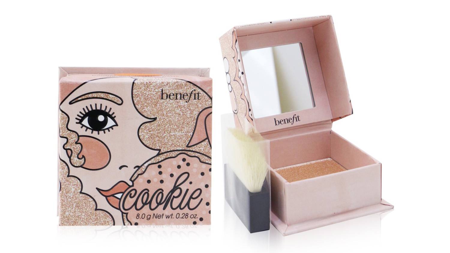 Get your glow on using Benefit Cookie Powder Highlighter. This silky, ultra-fine powder blends effortlessly into your skin, adding a soft gold shimmer to your cheekbones. Featuring a chic compact with a built-in mirror and brush, it’s perfect for on-the-go radiance.