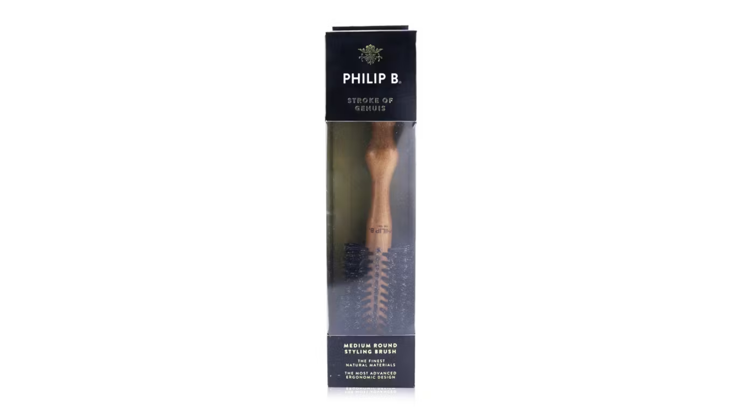 The Philip B Medium 55mm Round Brush is your go-to tool for smooth, voluminous blowouts. With 65% gentle boar bristles and 35% nylon, it detangles while taming static and stimulates the scalp. The beautifully sculpted mahogany handle offers an ergonomic grip and extra length to protect your hands from heat.