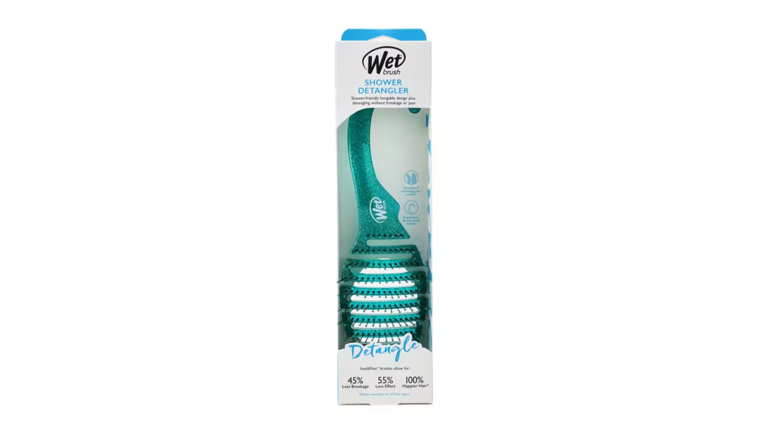 Equipped with exclusive, ultra-soft IntelliFlex bristles, the Wet Brush Shower Detangler makes hair grooming a breeze. This brush is designed to help reduce pain, curb split ends, and offer protection from breakage. Its OmniFlex technology comfortably follows your scalp's shape for a comfortable brushing experience, while the handy hook handle simplifies storage.
