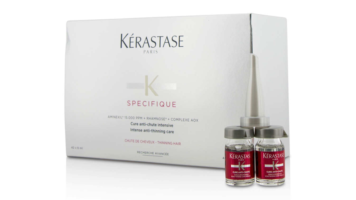 The Kerastase Specifique Intense Anti-Thinning Care is an advanced 6-week intensive treatment designed to visibly reduce hair loss. This powerful formula features Aminexil 15000 PPM to maintain density, along with Rhamnose, a vegetable sugar known for its anti-ageing benefits for hair. It also includes Complex AOX to defend against oxidative stress.