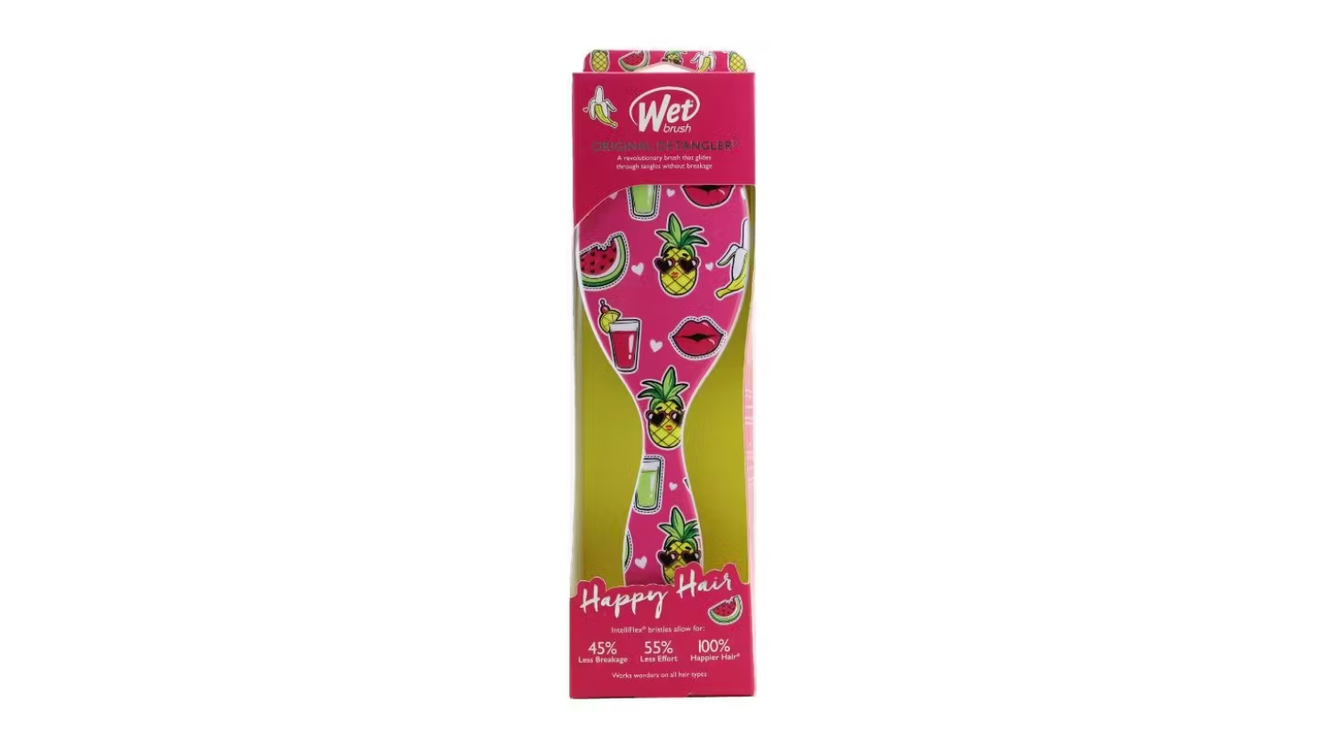Unveil healthier and more beautiful hair using the Wet Brush Original Detangler Happy Hair! Boasting exclusive, ultra-soft IntelliFlex bristles, this brush glides through tangles effortlessly. It helps reduce pain, inhibits split ends, and protects against breakage, making it a must-have tool for your grooming routine.