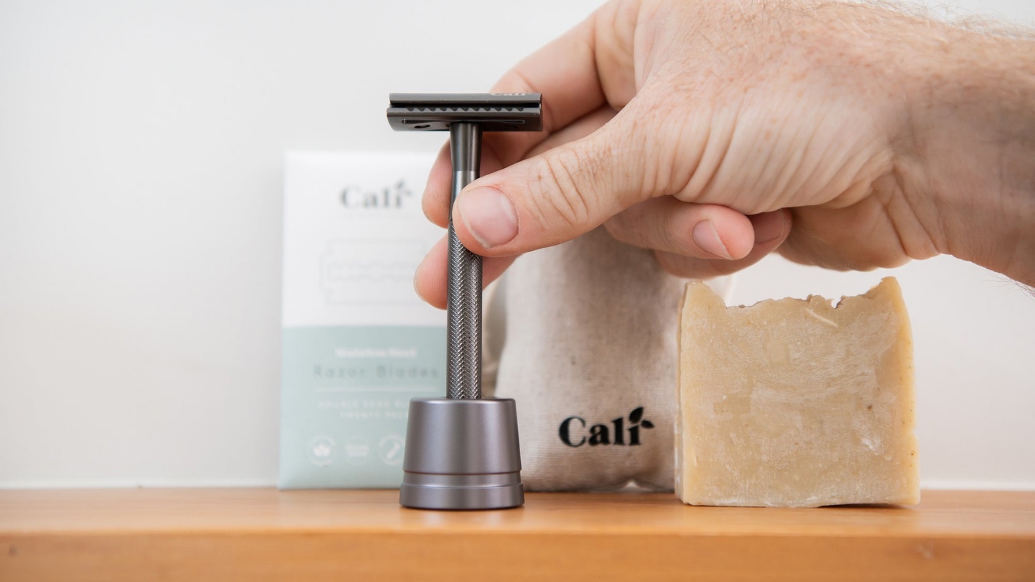 Enjoy an eco-friendly, convenient shaving experience with the CaliWoods Low-Waste Shave Kit with Razor Stand. This bundle includes a durable safety razor, a 20-blade refill pack, a rich shaving soap bar, and a handy linen travel bag. Now you can say goodbye to disposable plastic waste.