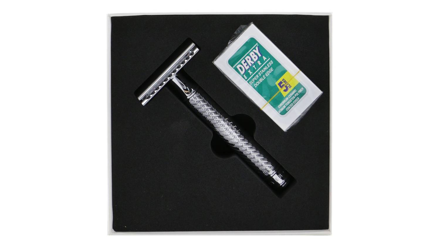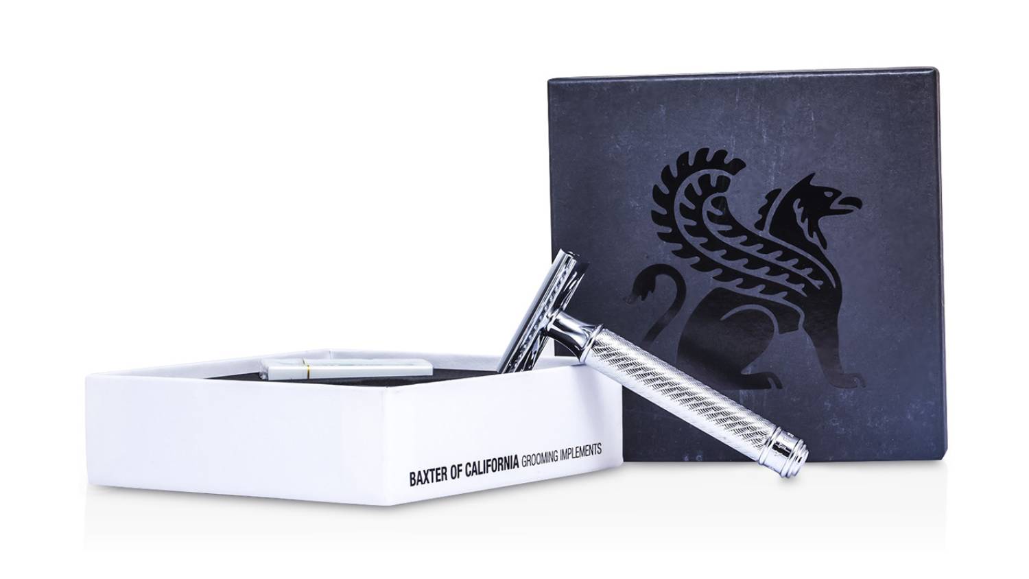 The Baxter Of California Double Edge Safety Razor delivers precision shaving with less irritation. Made from chrome-plated German steel, this razor offers a closer, smoother shave and includes five high-quality blades. It is perfect for those who value comfort and quality.