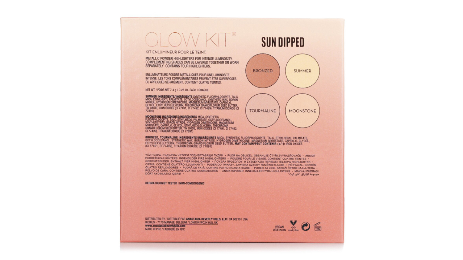 Get ready to shine with the Anastasia Beverly Hills Glow Kit (4x Highlighter) (# Sun Dipped)! This palette features four warm-toned highlighters that deliver a stunning, metallic finish. The lightweight, buildable formula is perfect for all skin tones and can be used anywhere on your face, body, or eyes. Plus, the removable magnetic pans let you customise your palette to suit your preferences.