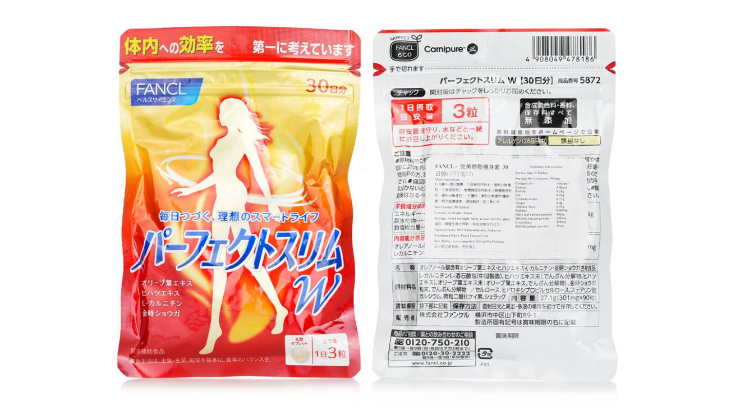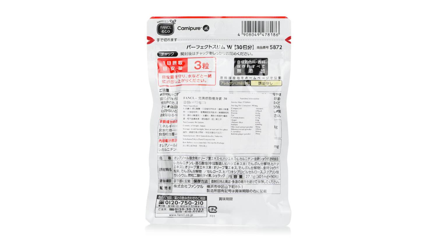 Reach your slim-down goals with the Fancl Perfect Slim W Diet Supplement. This Japanese diet supplement blends powerful ingredients like olive leaf, ginger, capsicum, L-carnitine, and coenzyme Q10 to ramp up your metabolism and help your body burn fat efficiently. This product consists of 90 tablets, thoughtfully designed to last for a full 30 days of consistent use.