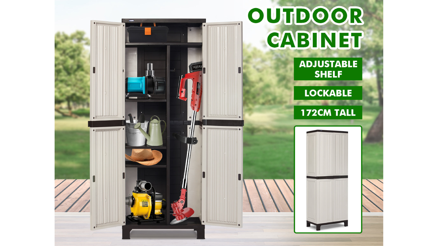 Organise in style with the TSB Living Full-Height Outdoor Storage Cabinet! This sleek and weatherproof unit offers ample storage for all your outdoor needs, from gardening tools to garage accessories. Adjustable shelves allow you to customise the space, while the elevated feet ensure your items stay dry and ready for use. Embrace a clutter-free and organised outdoor lifestyle with this storage solution.