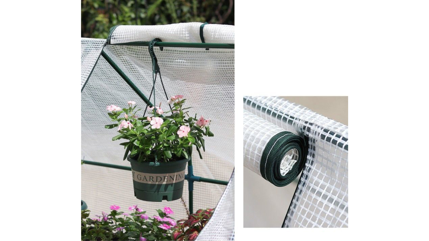 Give your plants the protection they deserve with the Kmall Miniature Greenhouse with Roll-Up Door! This cover is waterproof and anti-snow, keeping your flowers and veggies safe from rough weather conditions. Thanks to its thermal insulation, your plants stay cosy and healthy all year round. Built with a durable green powder-coated steel frame, it is sturdy enough for both indoor and outdoor use.