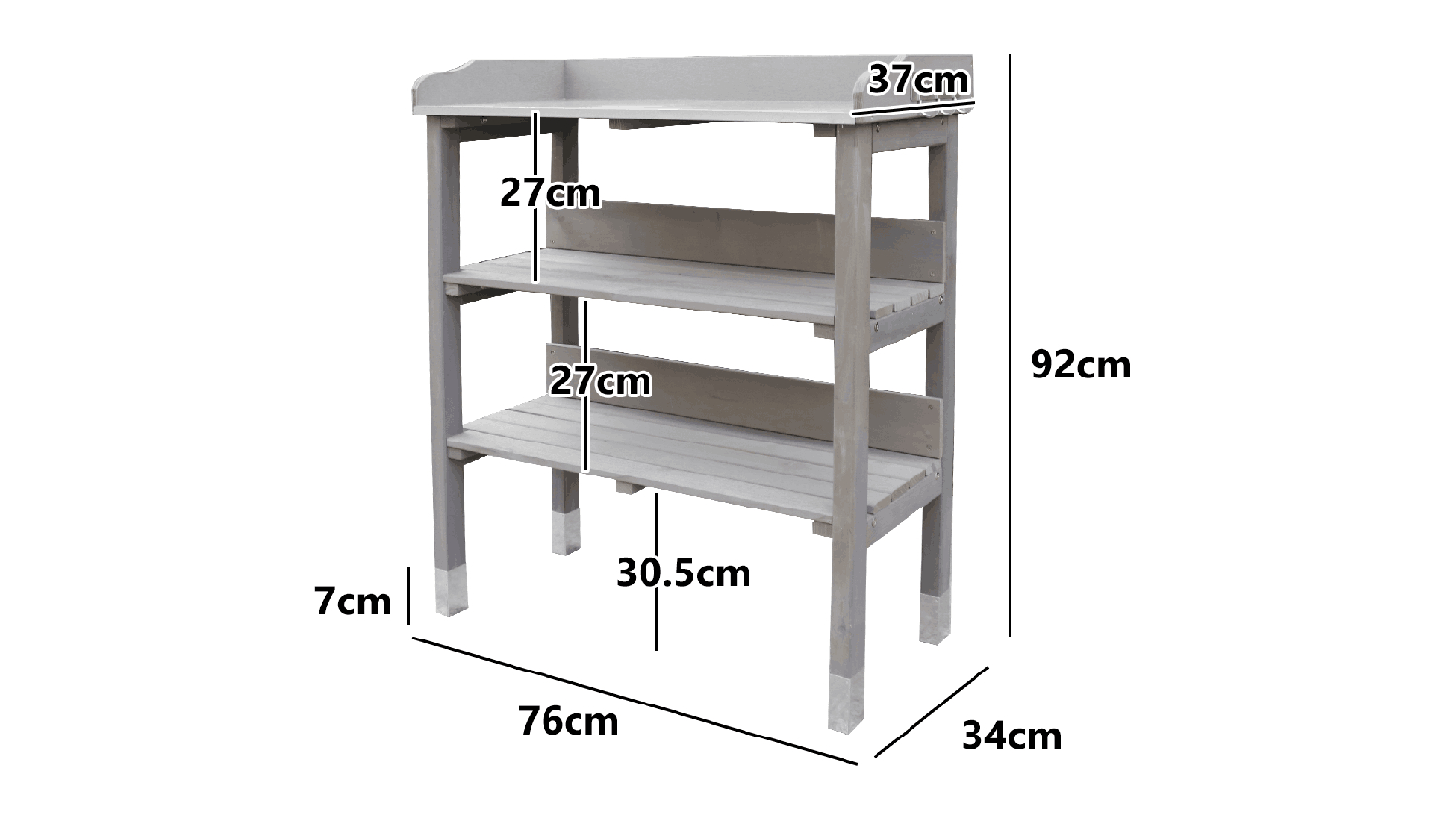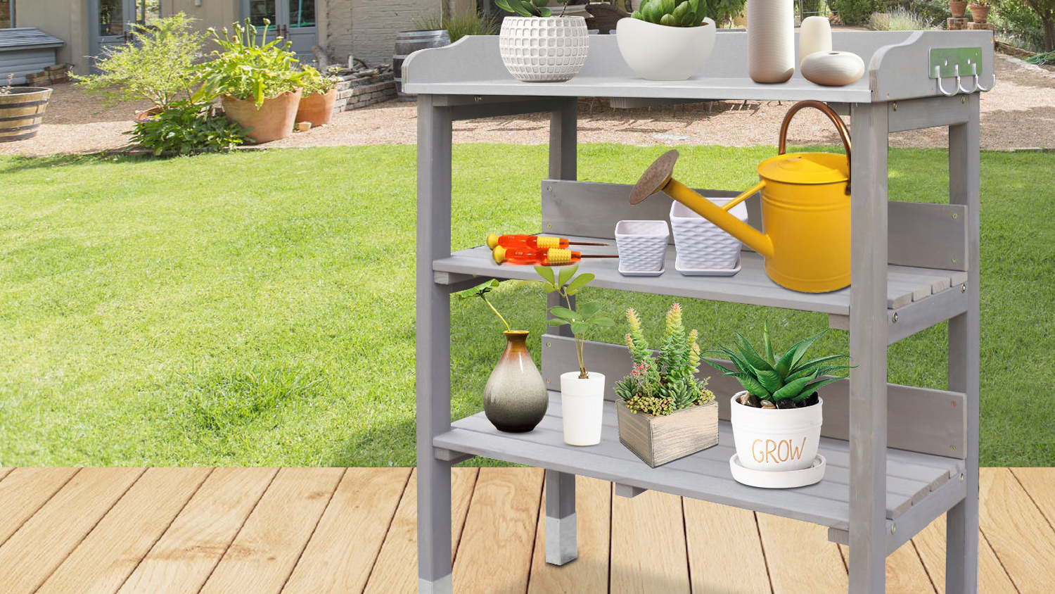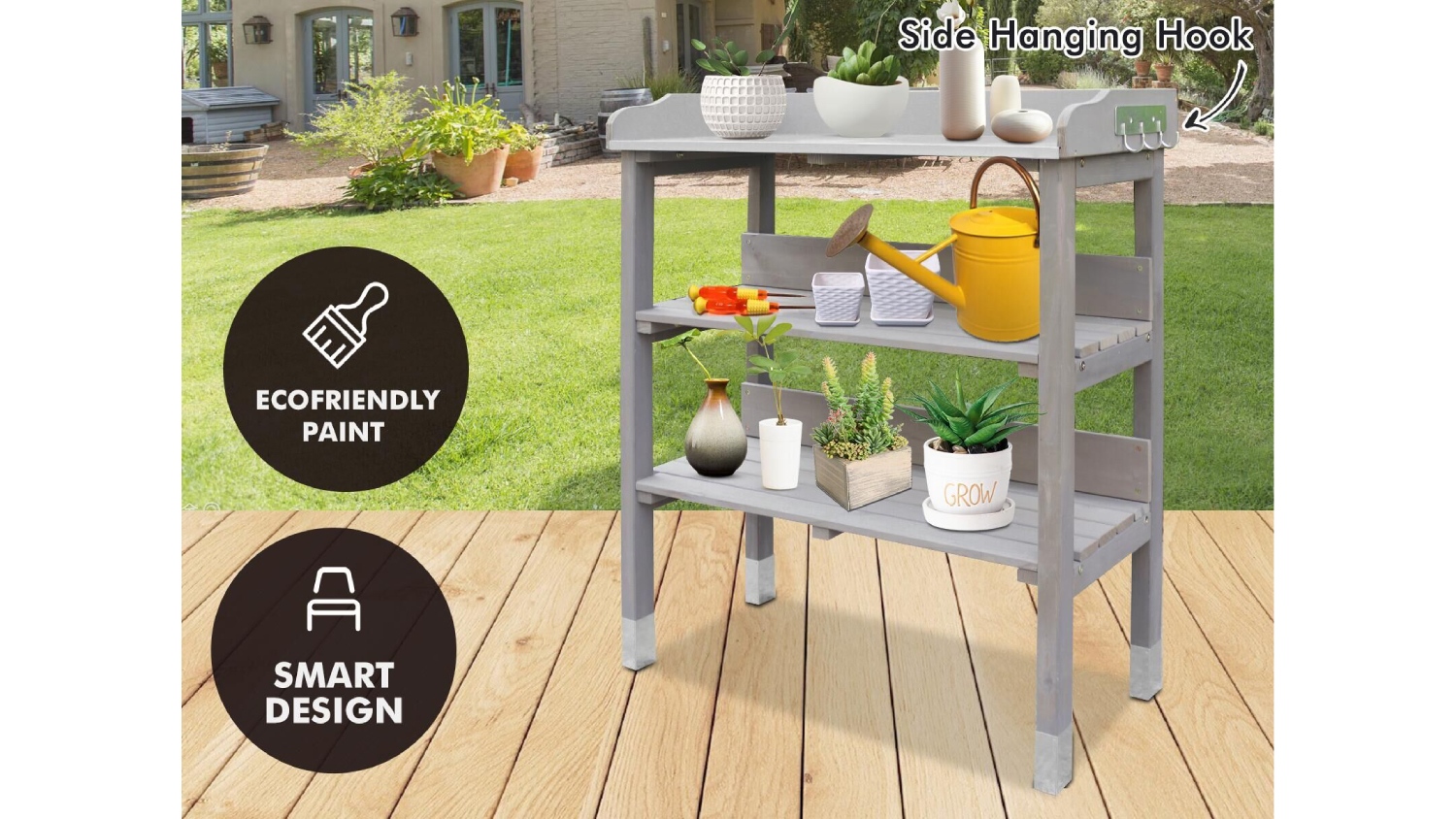 This TSB Living Outdoor Potting Bench is the perfect place to start seeds, transplant seedlings, and pot up your favourite plants. With its wide countertop, 3-tier open shelf, and side hanging hook, you'll have plenty of room to work and organise your gardening supplies.