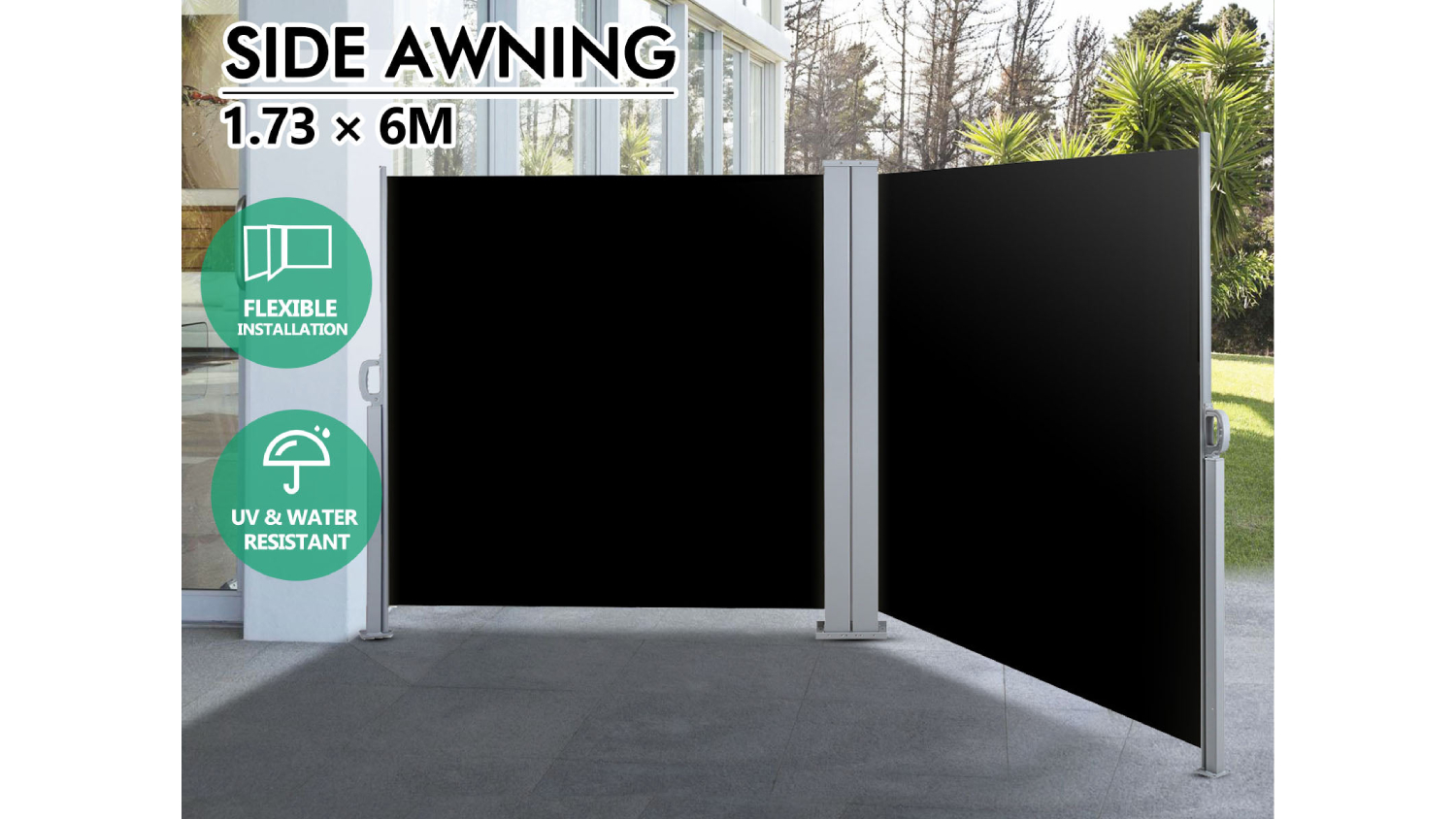 Enjoy your outdoor space to the fullest, as the TSB Living Double Wide Side Awning keeps harsh wind and low-lying sun at bay! Crafted with 100% water-resistant fabric and a robust frame, this awning offers incredible privacy, protection, and style. It also boasts an automatic roll-back function, making it ideal for any patio, backyard, balcony, and more.