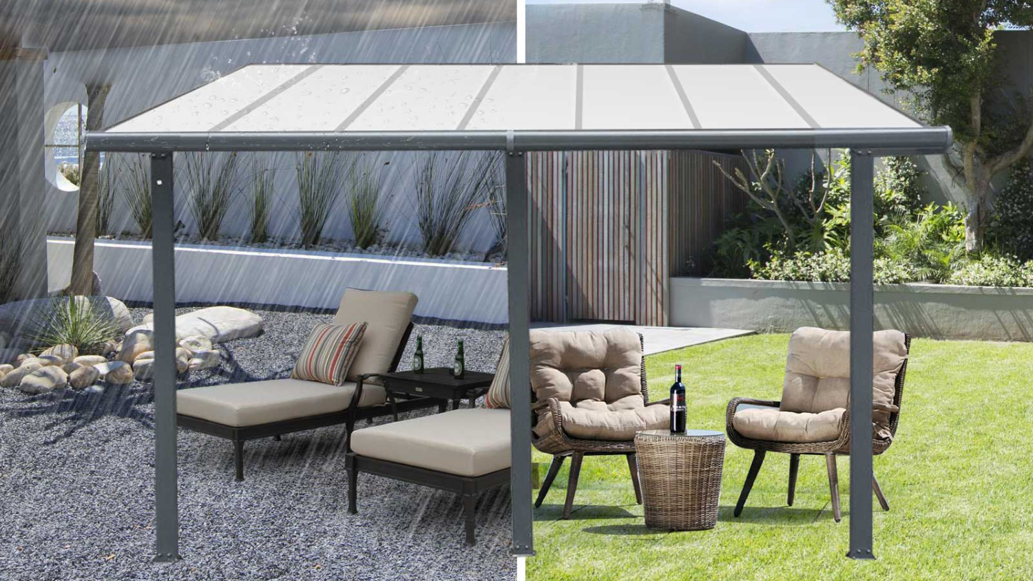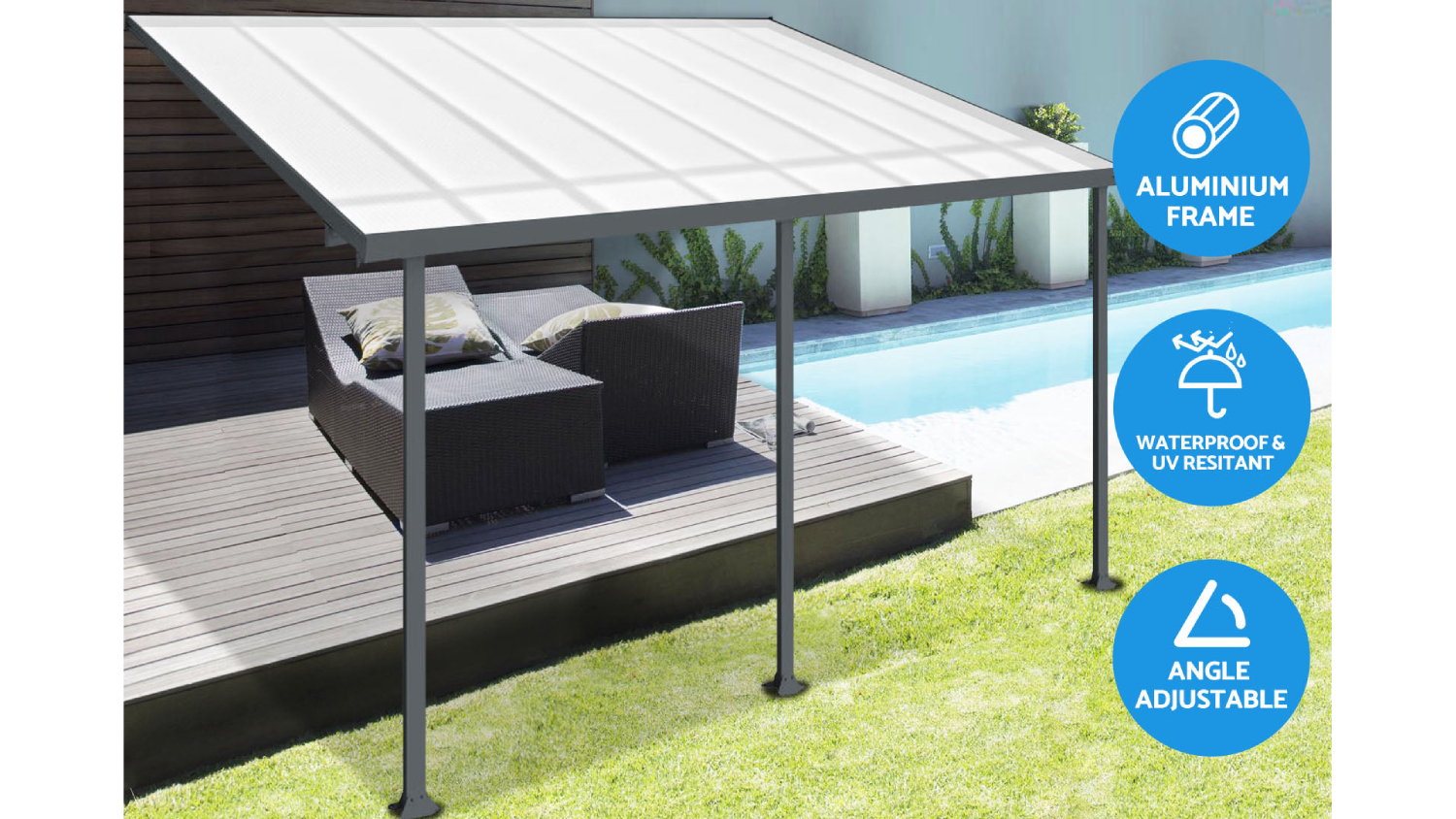 Enjoy your outdoor space in comfort and style with the TSB Living Aluminium Adjustable Outdoor Patio Canopy. Boasting a heavy-duty aluminium frame, anti-UV polycarbonate roof panels, and sturdy supporting legs, this canopy offers protection against unpredictable weather and harmful UV rays.