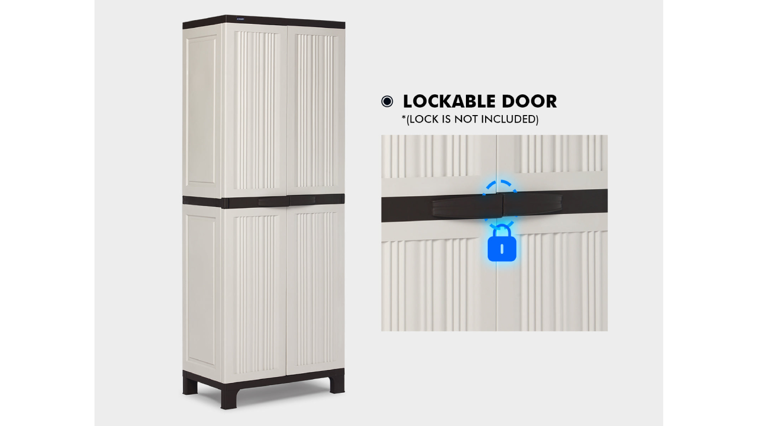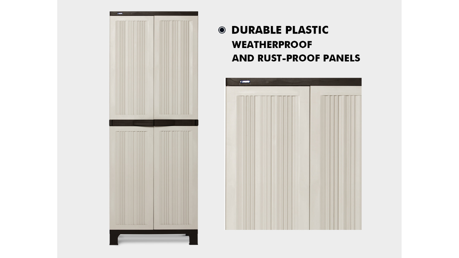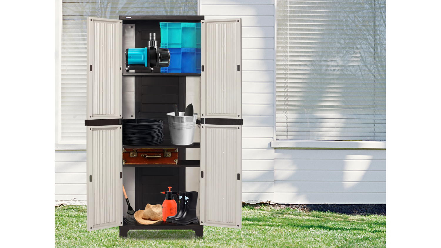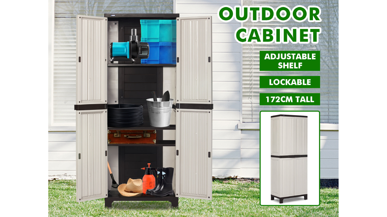 Keep your outdoor gear safe and dry with the TSB Living Secure Plastic Outdoor Cabinet with Adjustable Shelf. Made with durable, weatherproof plastic, this storage solution features adjustable shelves and nifty doors. Plus, its elevated design keeps your belongings protected from rain and flooding.