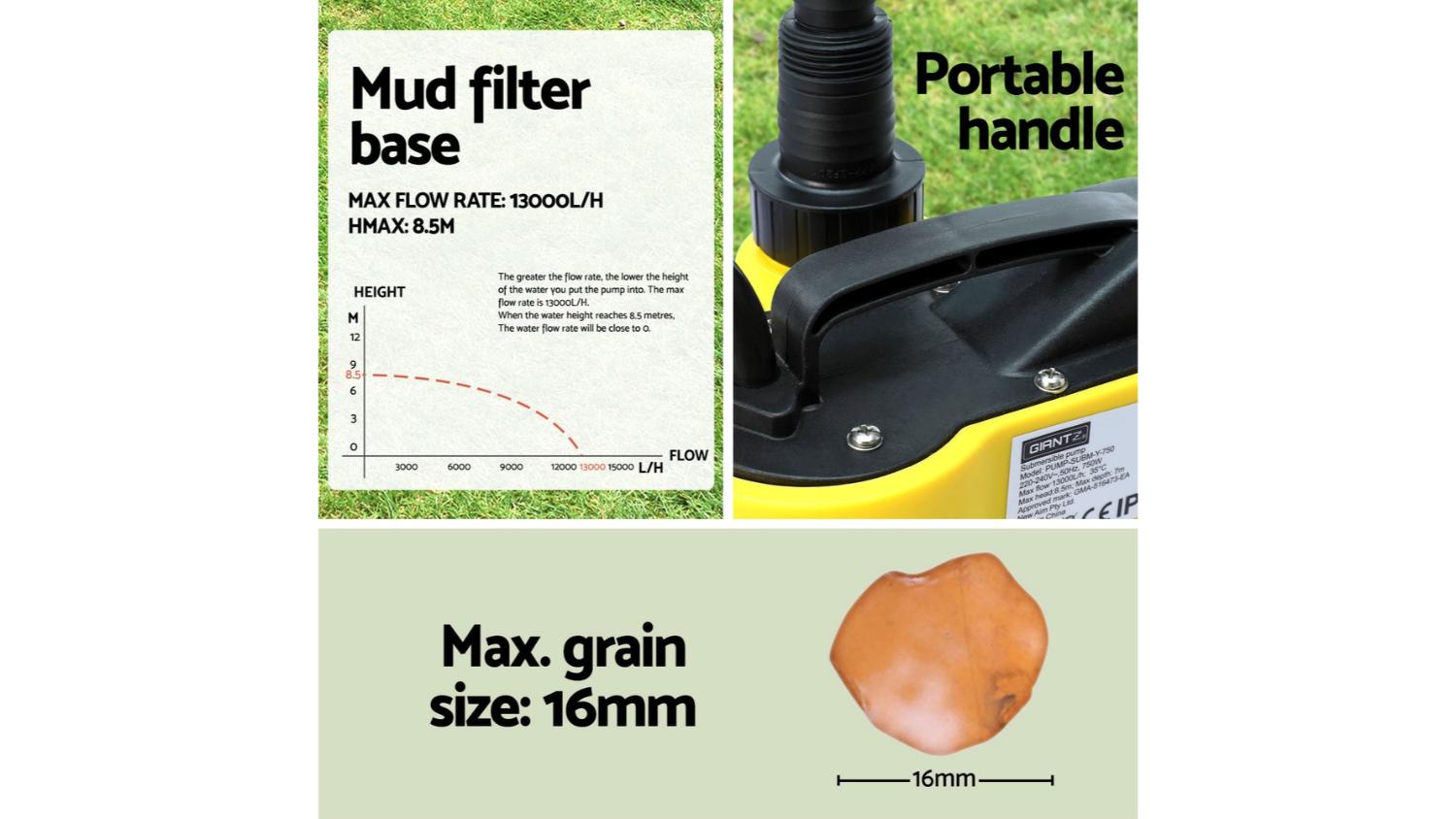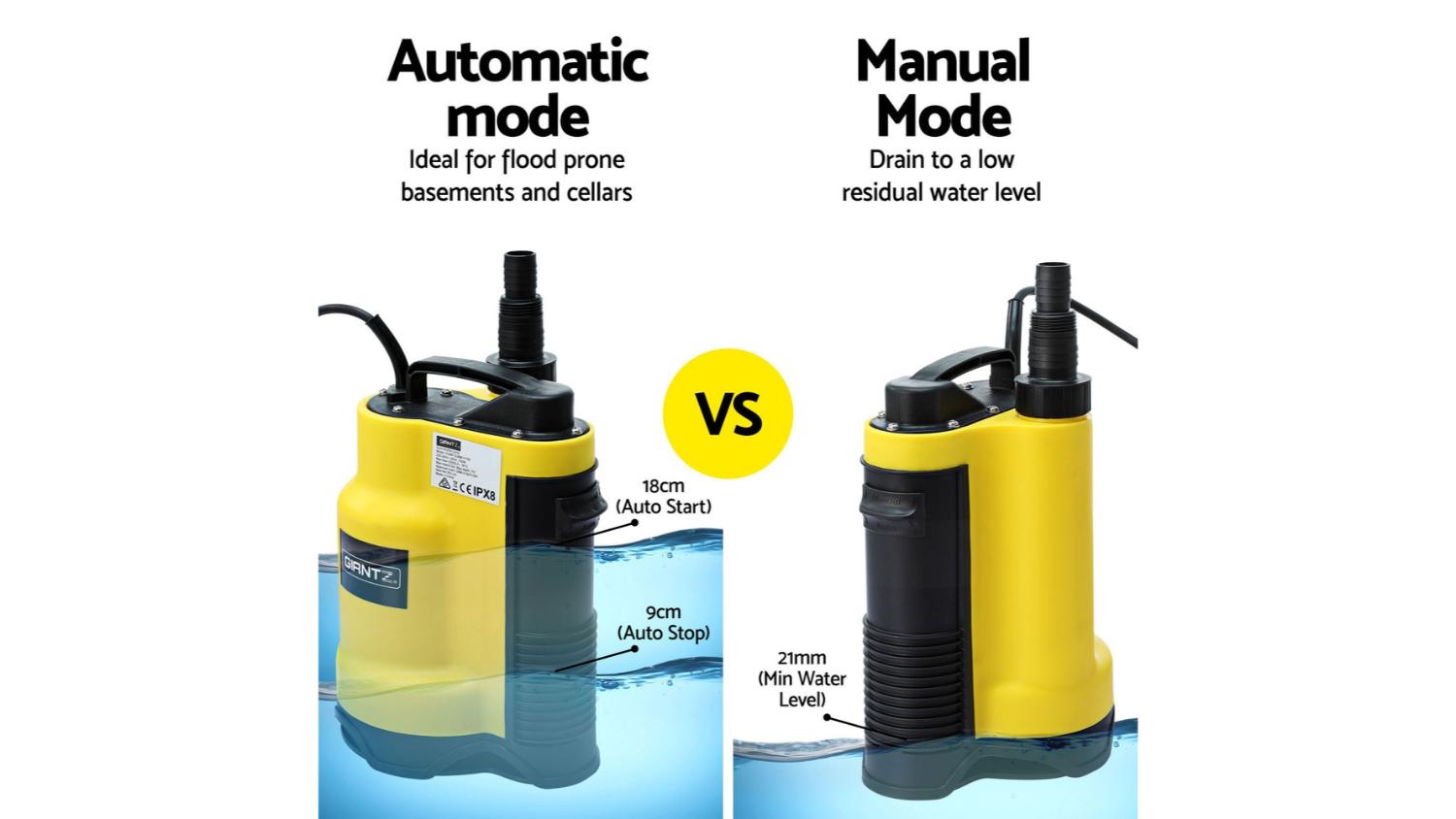 Make your water management more efficient with the Giantz Submersible Water Pump 750W! This pump can operate automatically (9-18cm start-stop levels) and can expel up to 13000 litres of water per hour. The motor runs quietly and efficiently and can be submerged to a depth of 8.5 metres. It is designed to work with dirty water, with a maximum solid passage of 16mm, so you can empty pools or flooded areas with ease.