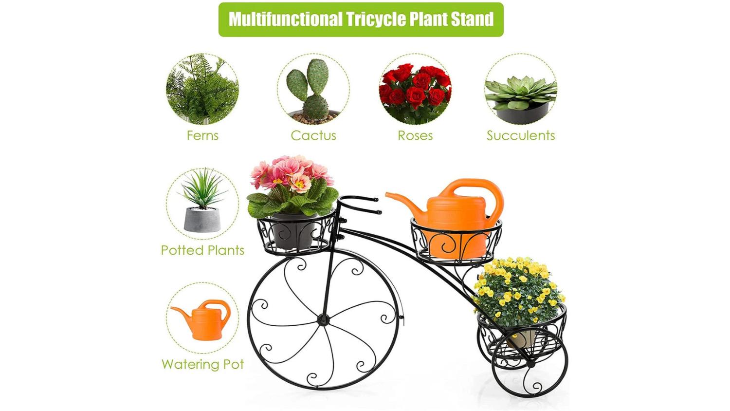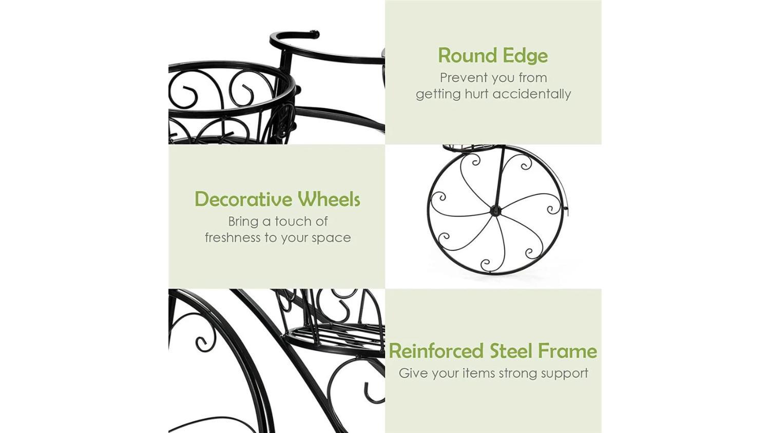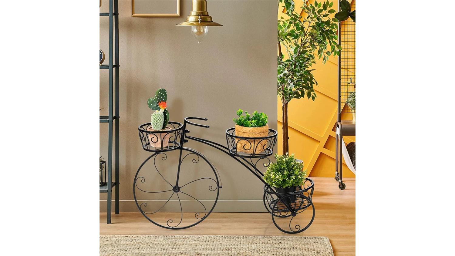 Add a touch of vintage charm to your space with the Pretty & Practical 3-Tier Sturdy Plant Stand in Bike design. Crafted from solid iron with a smooth black finish, it offers three secure pot holders and excellent ventilation thanks to its hollow-out basket design. Strong, stable, and easy to assemble, it’s a stylish way to showcase succulents, ferns, and more.