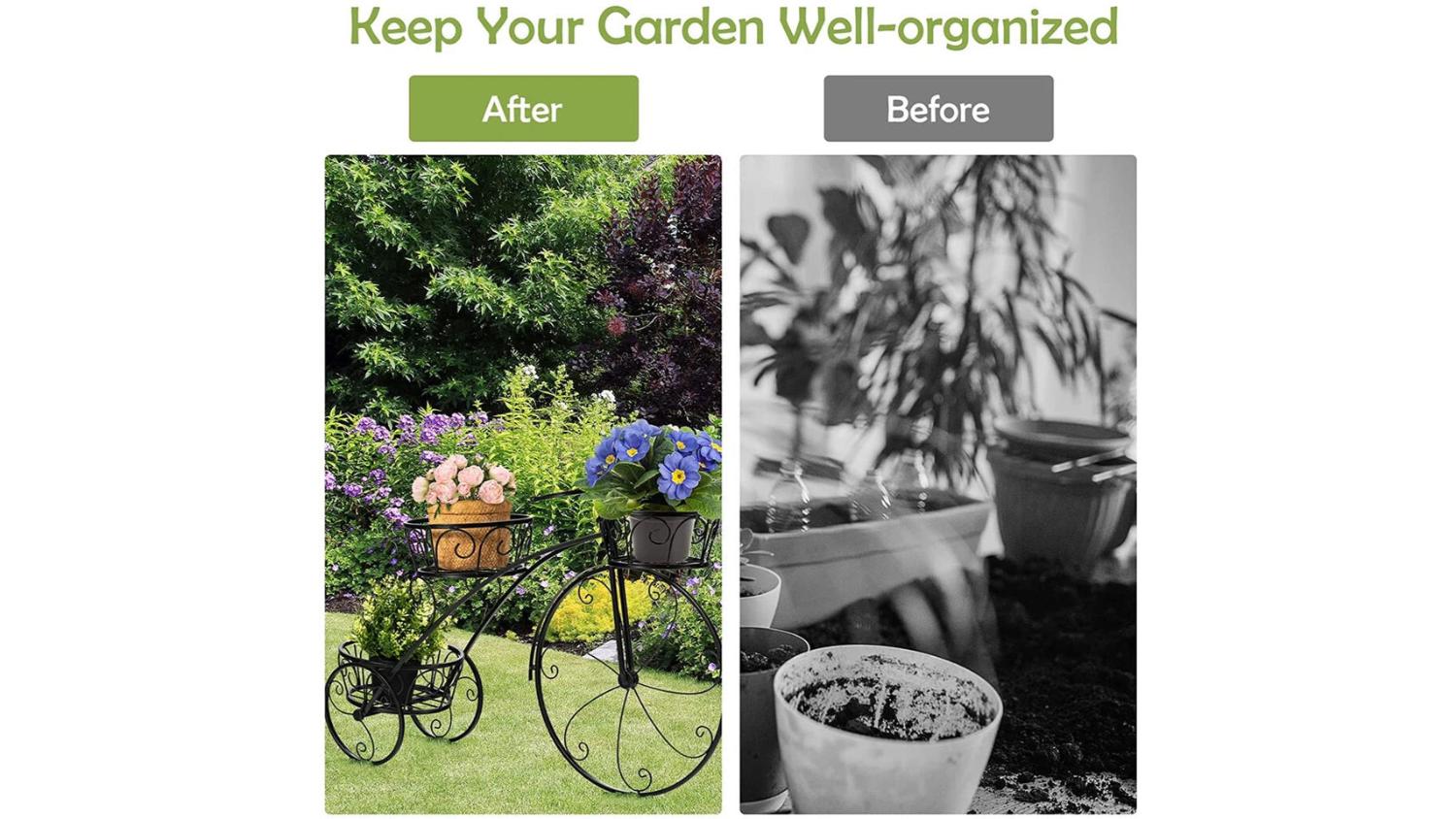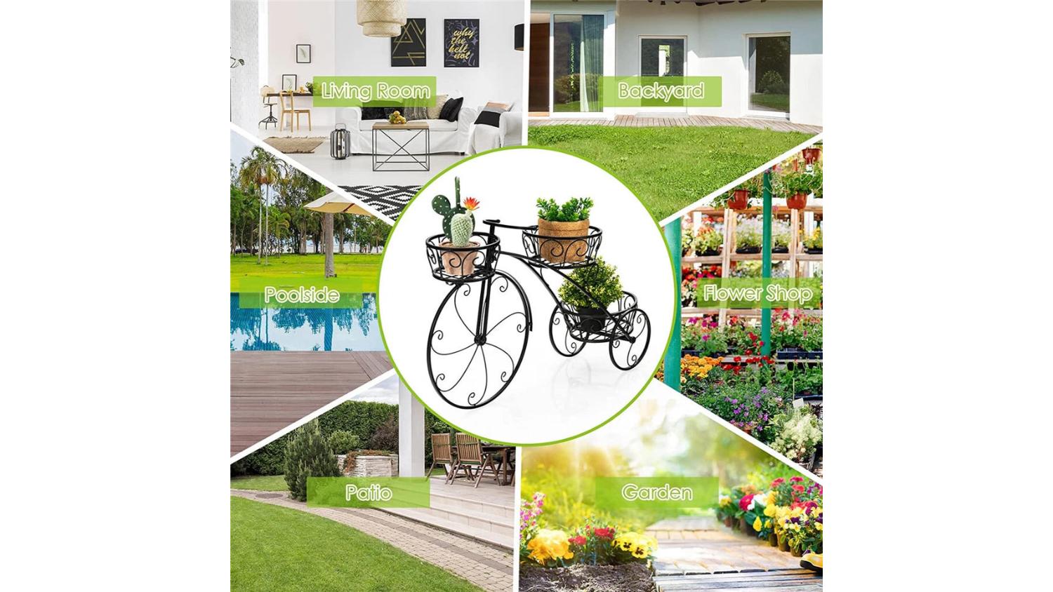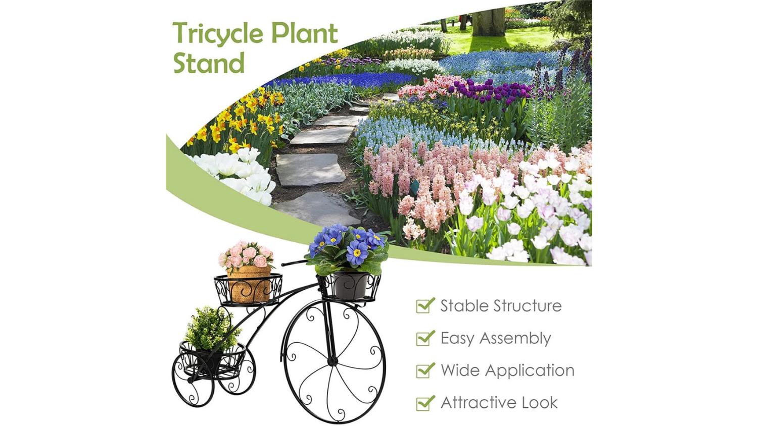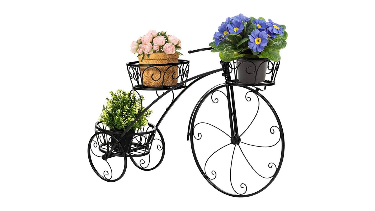 Add a touch of vintage charm to your space with the Pretty & Practical 3-Tier Sturdy Plant Stand in Bike design. Crafted from solid iron with a smooth black finish, it offers three secure pot holders and excellent ventilation thanks to its hollow-out basket design. Strong, stable, and easy to assemble, it’s a stylish way to showcase succulents, ferns, and more.