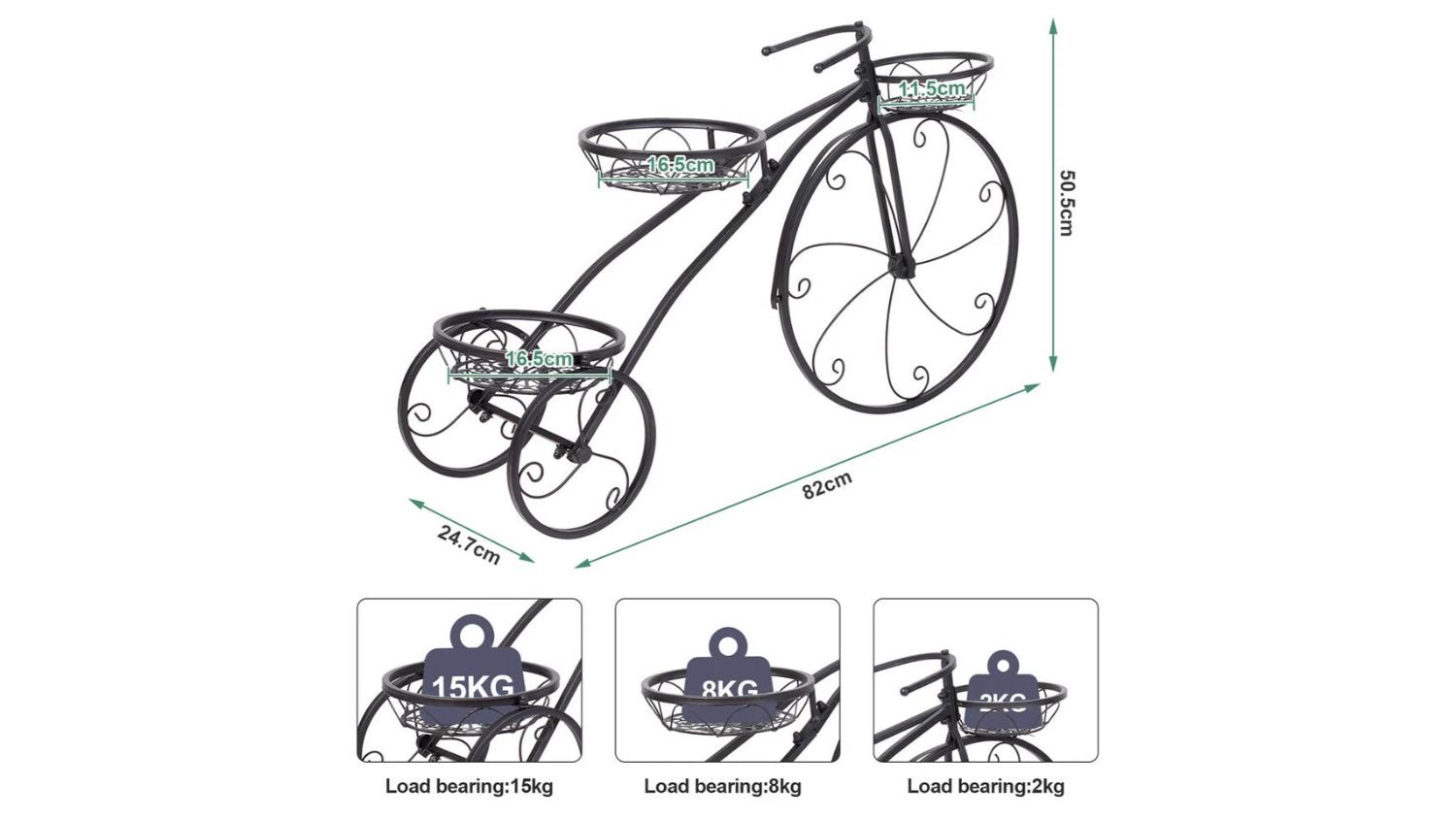 *Please note: The bicycle stand is decorative and stationary; wheels do not move. Check part orientation before tightening screws to avoid damage.