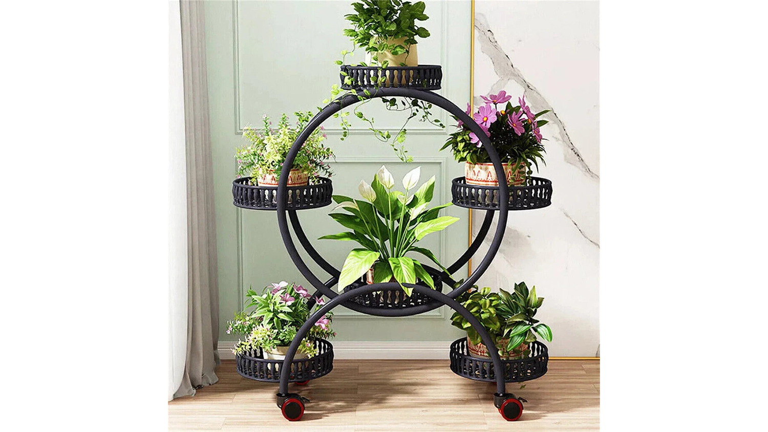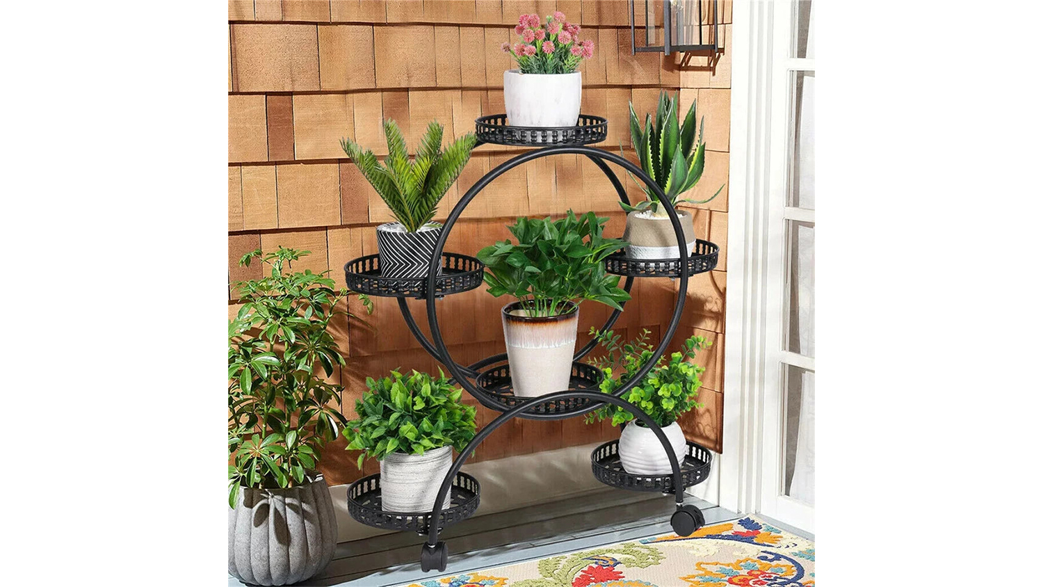 Add an elegant rustic touch to your garden with the Pretty & Practical Metal Plant Stand Cart. Designed with sturdy trays, this stand can fit up to 6 pots to help you curate a balanced mix of flowers and herbs. It also features lockable wheels to ensure it rolls smoothly yet stays firmly in place. Plus, it boasts a charming, round pastoral silhouette that blends beautifully with natural décor.