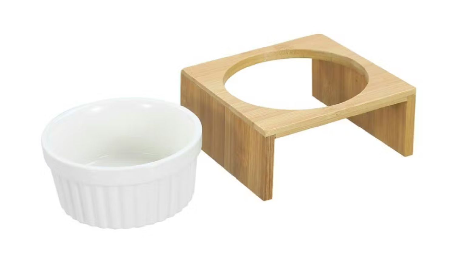 Ceramic Pet Cat Bowl Bamboo Base 13 x 12 x 7cm - 300ml