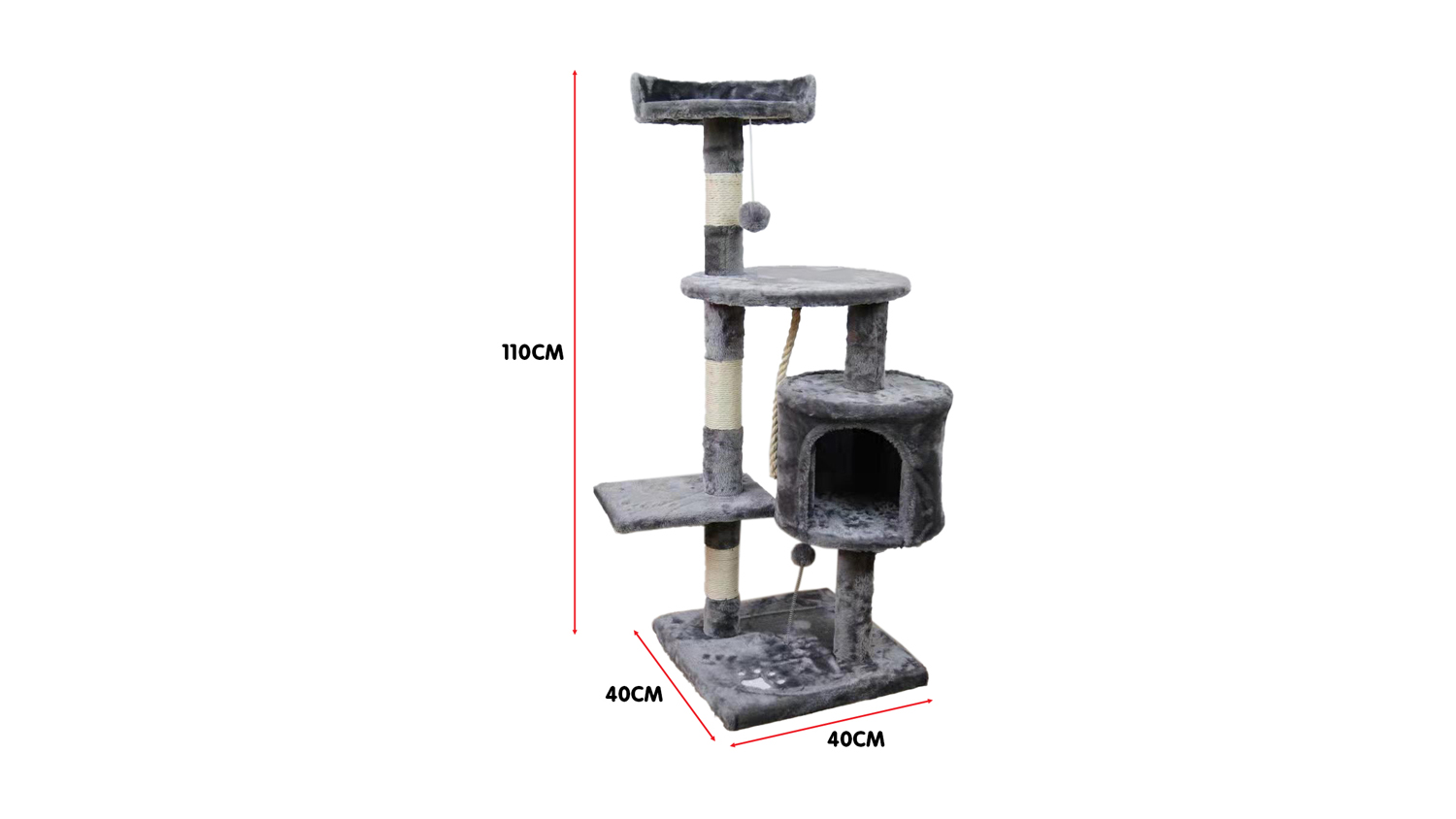 Provide a happy and cosy space for your paw-some pet with this Furtastic Cat Tree 110cm! Made from top-quality and eco-friendly materials, this cat condo is the perfect choice for your furry friend. It allows fun exploration since it features a round cubby house, a spring toy, rope and dangling ball, a built-in scratching post, and multiple storeys. Plus, it is covered with a comfy and luxe soft plush fabric, which is purr-fect for napping and lounging.
